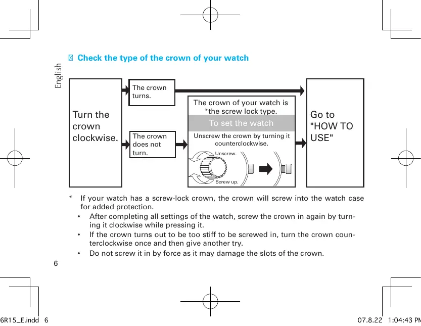 If your watch has a screw-lock crown, the crown will screw into the watch case for added protection. After completing all settings of the watch, screw the crown in again by turn- ing it clockwise while pressing If the crown turns out to be too stiff to be screwed in, turn the crown coun- terclockwise once and then give another try. Do not screw it in by force as it may damage the slots of the crown.