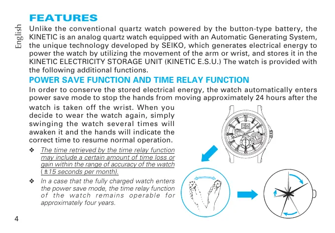 English FEATURES Unlike the conventional quartz watch powered by the button-type battery, the KINETIC is an analog quartz watch equipped with an Automatic Generating System, the unique technology developed by SEIKO, which generates electrical energy to power the watch by utilizing the movement of the arm or wrist, and stores it in the KINETIC ELECTRICITY STORAGE UNIT (KINETIC E.S.U.) The watch is provided with the following additional functions. POWER SAVE FUNCTION AND TIME RELAY FUNCTION In order to conserve the stored electrical energy, the watch automatically enters power save mode to stop the hands from moving approximately 24 hours after the watch is taken off the wrist. When you decide to wear the watch again, simply swinging the watch several times will awaken it and the hands will indicate the correct time to resume normal operation. + Ihe time retrieved by the time relay function May include a certain amount of time loss ot gain within the range of acouracy of the watch L#15 seconds per month} + In a case that the fully charged watch enters the power save mode, the time relay function of the watch remains operable for L_2 approximately four years.