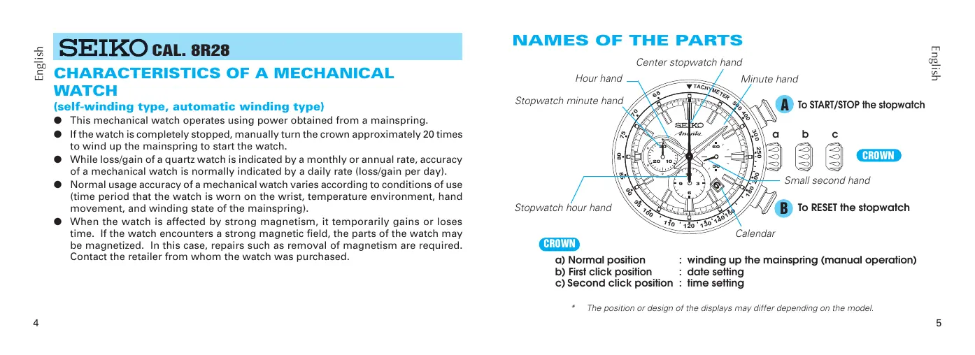 Download the instructions for your Automatic chronograph watch in PDF format for free! Find your manual 8R28 AUTOMATIC CHRONOGRAPH - SEIKO and take your electronic device back in hand. On this page are published all the documents necessary for the use of your device. 8R28 AUTOMATIC CHRONOGRAPH by SEIKO.