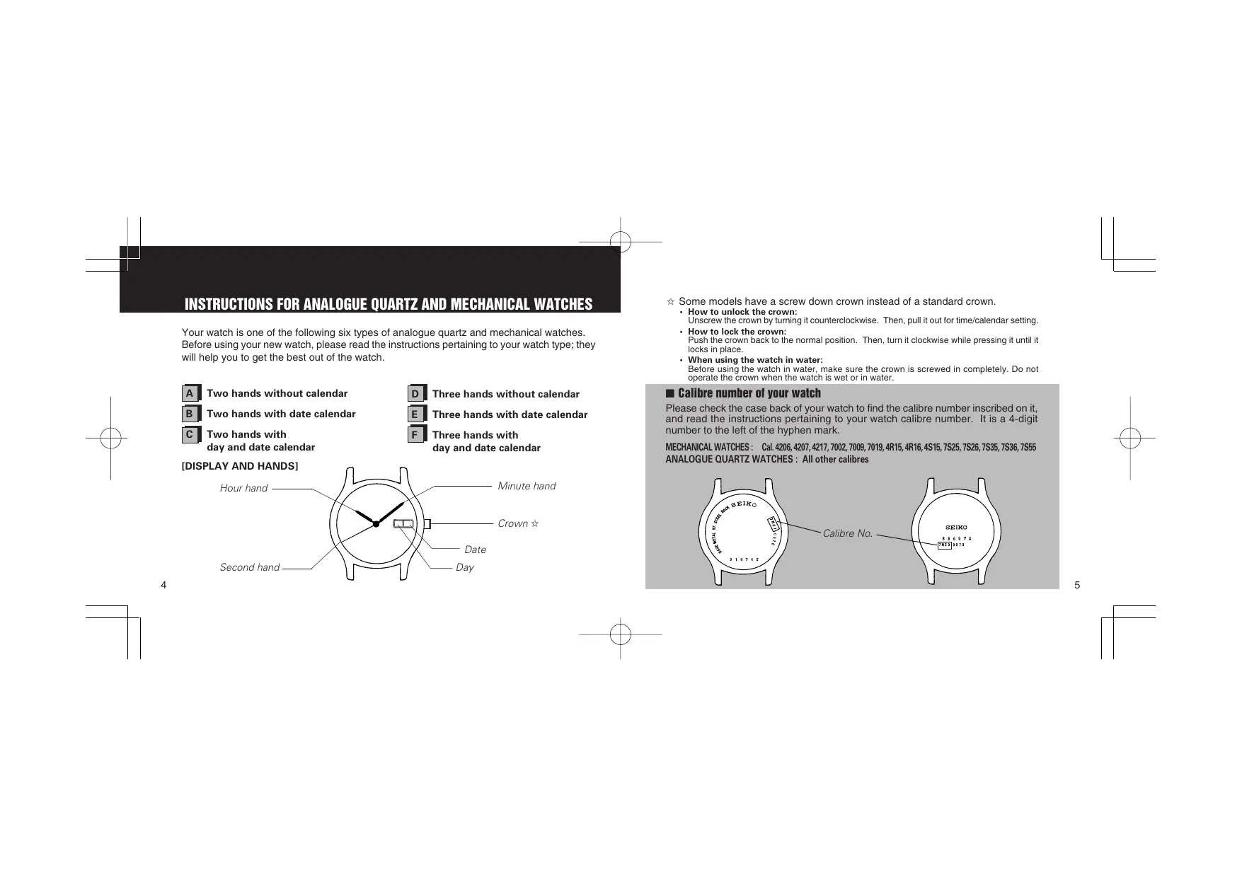 Hour hand Minute hand Crown # Second hand # Some models have a screw down croun instead of a standard crown. + How to unlock the crown: Unscrew the croun by lumingit counterclockwise. Then, pul it out for lime/calendar setting. + How to lock the crown: Push the croun back to the normal position. Then, turn it clockwise while pressing it until it locks in place. + When using the watch in water: Before using the walch in water, make sure the croun is screwed in completely. Do not operate lhe croun wen lhe waléh Is wet or in water. M Calibre number of your watch Please check the case back of your watch to find the calibre number inscribed on i, and read the instructions pertaining to your watch calibre number. it is a 4-digit number to the left of the hyphen mark. MECHANICAL WATCHES : Ca. 4206 4207, 4217, 7002, 008, 019,415, AR16, 4515, 7625, 1525, 1835, 1836, 1855 ANALOGUE QUARTZ WATCHES : All other calibres Calibre No.