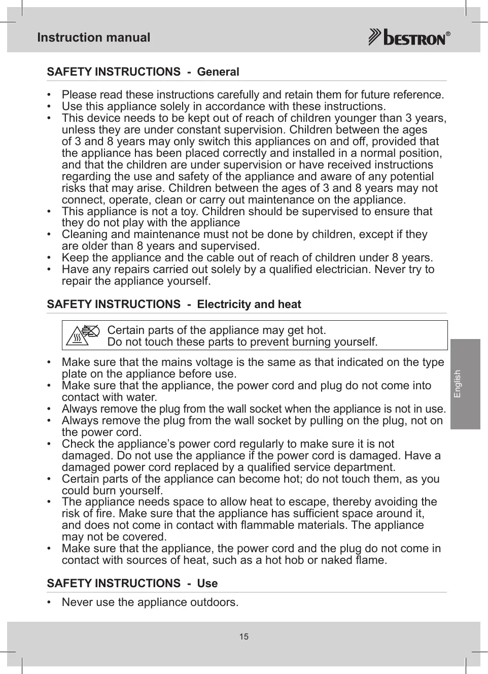 - Have any repairs carried out solely by a qualified electrician. Never try to repair the appliance yourself. Safety instructions - Electricity and heat Certain parts of the appliance may get hot. Do not touch these parts to prevent burning yourself.