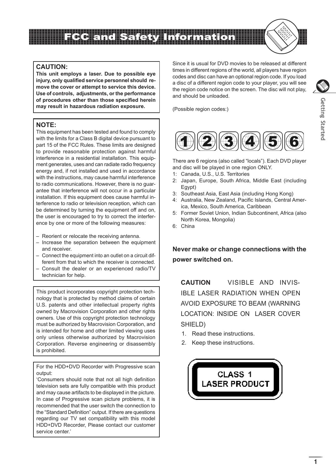 to provide reasonable protection against harmful interference in a residential installation. This equip- ment generates, uses and can radiate radio frequency energy and, if not installed and used in accordance with the instructions, may cause harmful interference to radio communications. However, there is no guar- antee that interference will not occur in a particular installation. If this equipment does cause harmful in- terference to radio or television reception, which can be determined by turning the equipment off and on, the user is encouraged to try to correct the interfer- ence by one or more of the following measures: — Reorient or relocate the receiving antenna. — Increase the separation between the equipment and receiver. — Connect the equipment into an outlet on a circuit dif- ferent from that to which the receiver is connected. — Consult the dealer or an experienced radio/TV technician for help. This product incorporates copyright protection tech- nology that is protected by method claims of certain US. patents and other intellectual property rights owned by Macrovision Corporation and other rights owners. Use of this copyright protection technology must be authorized by Macrovision Corporation, and is intended for home and other limited viewing uses only unless otherwise authorized by Macrovision Corporation. Reverse engineering or disassembly is prohibited. For the HDD+DVD Recorder with Progressive scan output: ‘Consumers should note that not all high definition television sets are fully compatible with this product and may cause artifacts to be displayed in the picture. In case of Progressive scan picture problemes, it is recommended that the user switch the connection to the “Standard Definition” output. Ifthere are questions regarding our TV set compatibility with this model HDD+DVD Recorder, Please contact our customer service center."