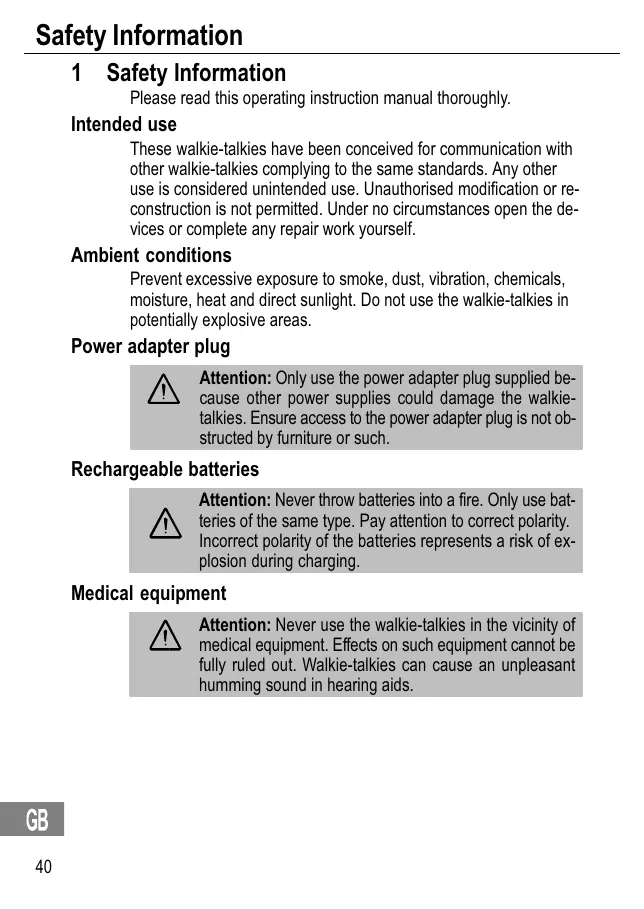 Safety Information 1 Safety Information Please read this operating instruction manual thoroughly. Intended use These walkie−talkies have been conceived for communication with other walkie−talkies complying to the same standards. Any other use is considered unintended use. Unauthorised modification or reconstruction is not permitted. Under no circumstances open the devices or complete any repair work yourself. Ambient conditions Prevent excessive exposure to smoke, dust, vibration, chemicals, moisture, heat and direct sunlight. Do not use the walkie−talkies in potentially explosive areas. Power adapter plug Attention: Only use the power adapter plug supplied because other power supplies could damage the walkie− talkies. Ensure access to the power adapter plug is not obstructed by furniture or such. Rechargeable batteries Attention: Never throw batteries into a fire. Only use batteries of the same type. Pay attention to correct polarity. Incorrect polarity of the batteries represents a risk of explosion during charging. Medical equipment Attention: Never use the walkie−talkies in the vicinity of medical equipment. Effects on such equipment cannot be fully ruled out. Walkie−talkies can cause an unpleasant humming sound in hearing aids.