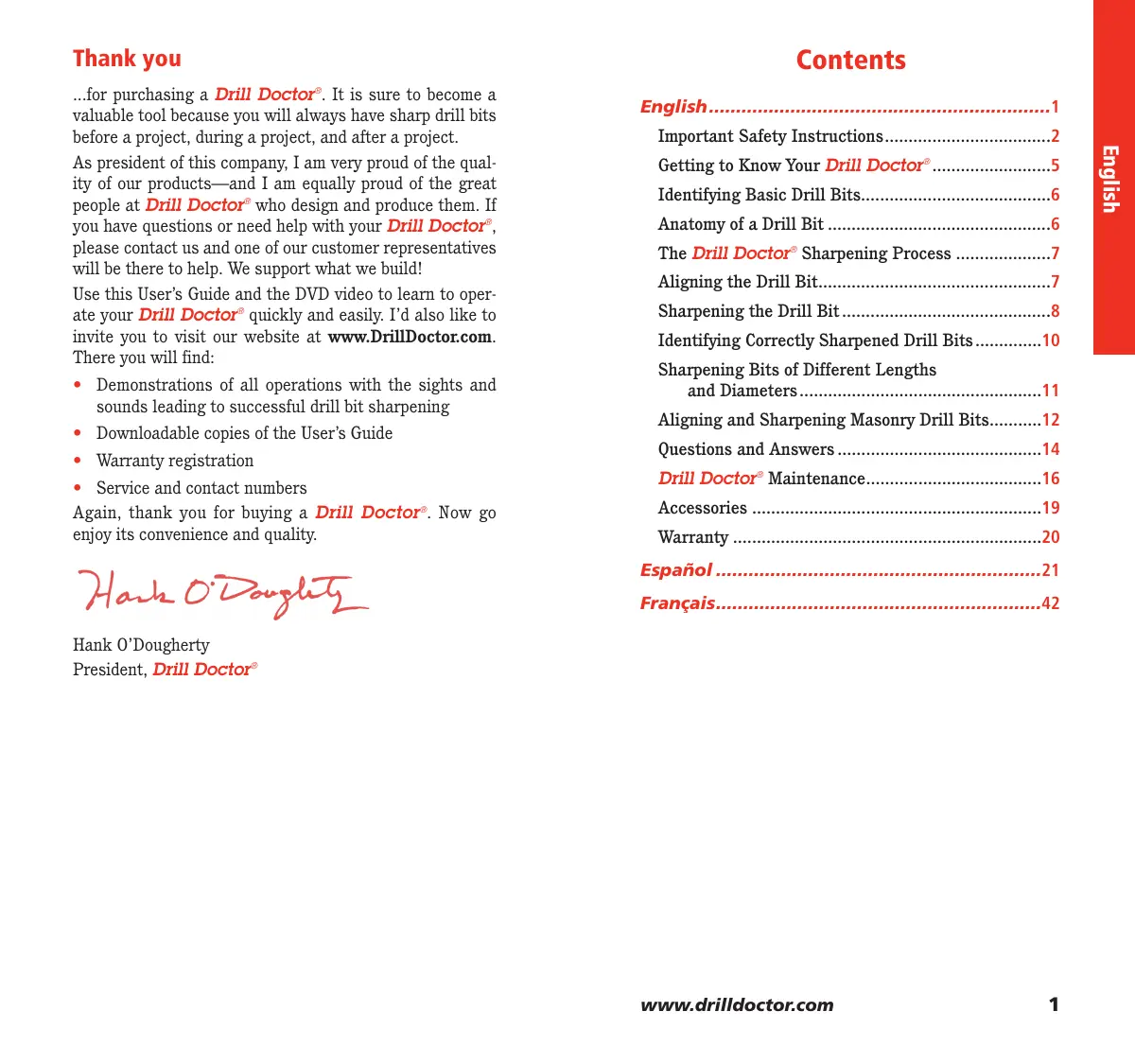 - Service and contact numbers Again, thank you for buying a Drill Doctor®. Now go enjoy its convenience and quality. Hank O’Dougherty President, Drill Doctor® www.drilldoctor.com