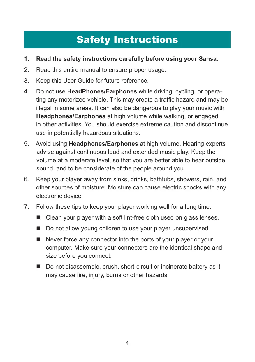 5 & D 2 Safety Instructions Read the safety instructions carefully before using your Sansa. Read this entire manual to ensure proper usage. Keep this User Guide for future reference. Do not use HeadPhones/Earphones while driving, cycling, or opera- ting any motorized vehicle. This may create a traffic hazard and may be illegal in some areas. lt can also be dangerous to play your music with Headphones/Earphones at high volume while walking, or engaged in other activities. You should exercise extreme caution and discontinue use in potentially hazardous situations. Avoid using Headphones/Earphones at high volume. Hearing experts advise against continuous loud and extended music play. Keep the volume at a moderate level, so that you are better able to hear outside sound, and to be considerate of the people around you. Keep your player away from sinks, drinks, bathtubs, showers, rain, and other sources of moisture. Moisture can cause electric shocks with any electronic device. Follow these tips to keep your player working well for a long time: M Clean your player with a soft lint-free cloth used on glass lenses. m Do not allow young children to use your player unsupervised. m Never force any connector into the ports of your player or your computer. Make sure your connectors are the identical shape and size before you connect. m Do not disassemble, crush, short-circuit or incinerate battery as it may cause fire, injury, burns or other hazards