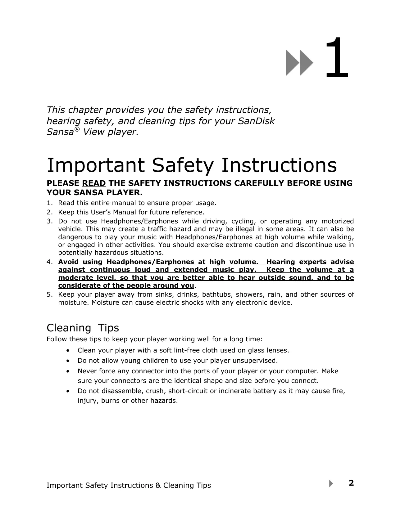 This chapter provides you the safety instructions, hearing safety, and cleaning tips for your SanDisk Sansa® View player. Important Safety Instructions PLEASE READ THE SAFETY INSTRUCTIONS CAREFULLY BEFORE USING YOUR SANSA PLAYER.
