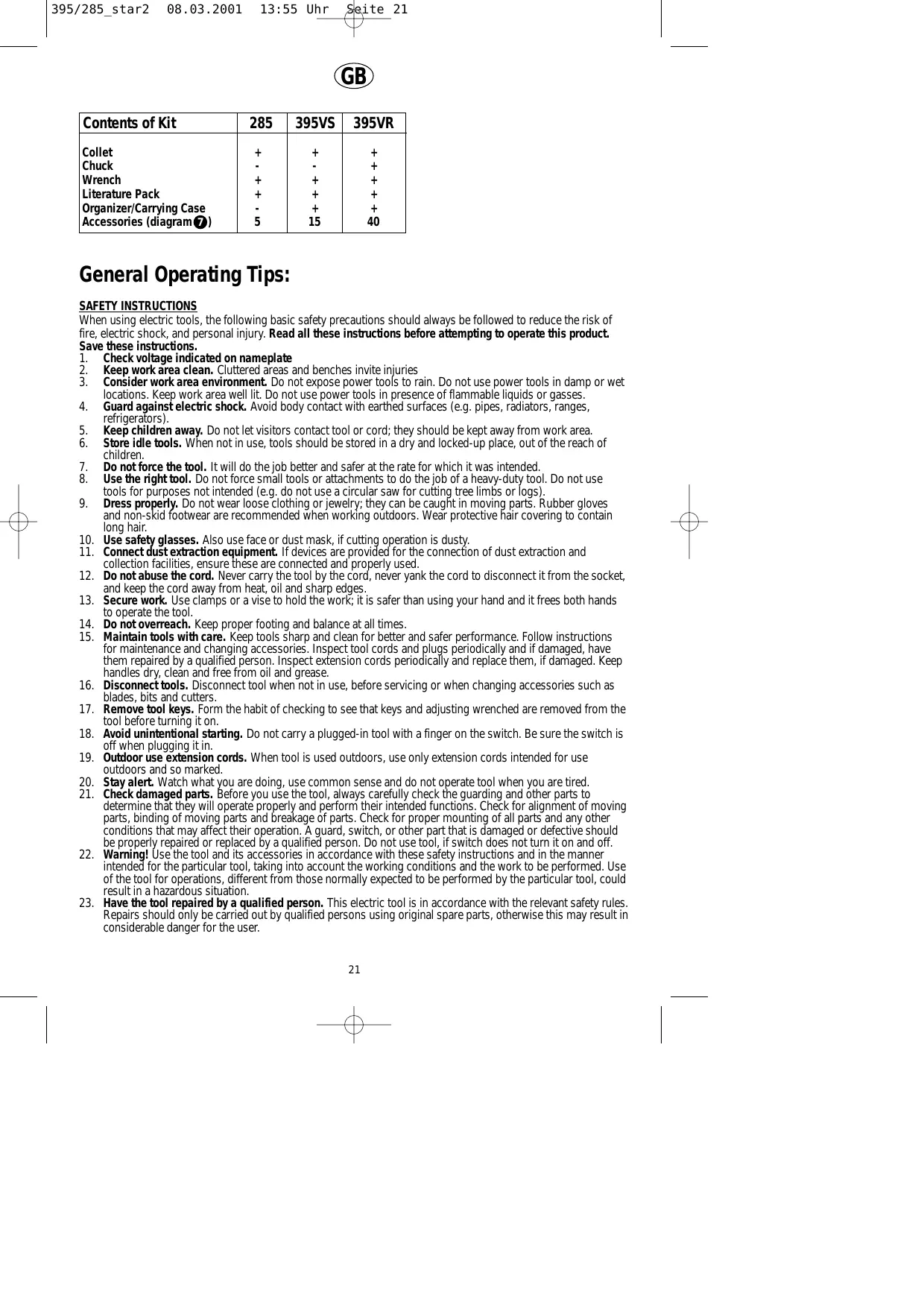 Always keep the cord away from moving parts of the tool When you put away the tool, switch off the motor and ensure that all moving parts have come to a complete standstill In case of electrical or mechanical malfunction, immediately switch off the tool and disconnect the plug Use completely unrolled and safe extension cords with a capacity of 16 Amps (U.K. 13 Amps) Only use the original DREMEL accessories which can be obtained from your DREMEL dealer. Before using accessories always compare the maximum allowed r.p.m. of that specific accessory with the r.p.m. of the tool This tool should not be used by people under the age of 16 years Never use grinding wheels over 1 1/4” (32 mm) Ø Never use drill bits over 1/8” (3.2 mm) Ø Never use shaft lock while tool is running Store tool in locations where temperature will not exceed 50°C Ensure that the collet size corresponds with the shaft size of the accessory Keep the air vent openings clean and uncovered Handle and store grinding/cutting discs carefully to avoid chipping and cracking Do not use damaged, deformed or vibrating grinding/cutting discs For mounting/using non-Dremel accessories observe the instructions of the manufacturer concerned Before using the tool • ensure that accessory is correctly mounted and firmly tightened • check if accessory runs freely by turning it by hand • test-run tool for at least 30 seconds at highest no-load speed in a safe position • stop immediately in case of considerable vibration or other defects and check tool to determine the cause ! Never use a cutting disc for side grinding When grinding metal, sparks are generated; keep other persons and combustible material from work area Wear protective glasses and gloves, hearing protection, a dust mask, and sturdy shoes; when necessary also wear an apron ! The accessory continues to rotate for a short time after the tool has been switched off