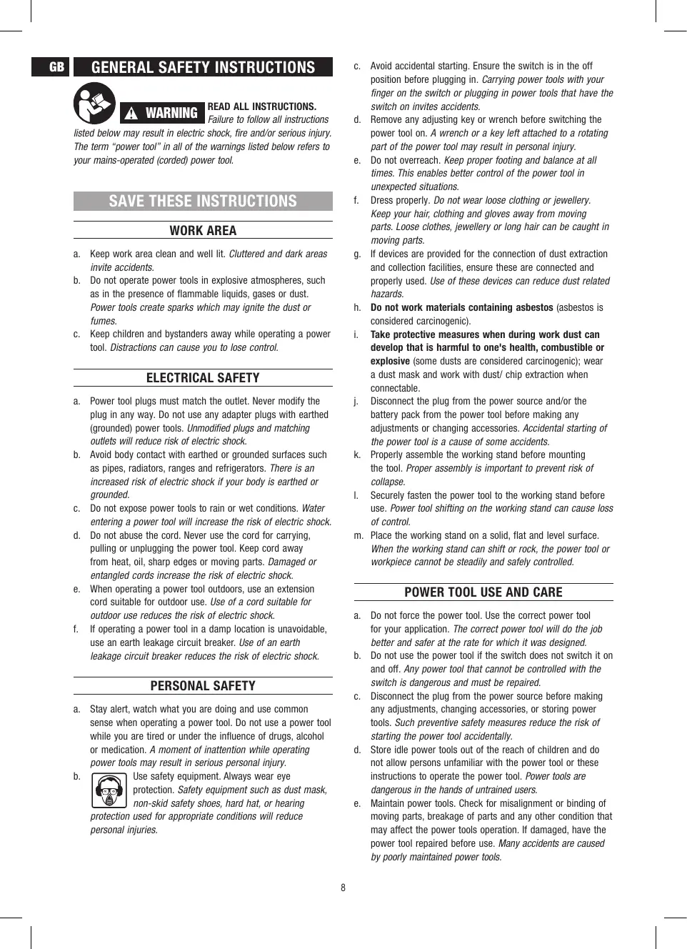 k. Assemblez correctement le support de travail avant de monter l'outil. Un assemblage correct est essentiel afin d'éviter tout risque d'effondrement. l. Fixez fermement l'outil électrique sur le support de travail avant toute utilisation. Un mouvement inopiné de l'outil sur le support de travail peut vous faire perdre le contrôle. m. Placez le support de travail sur une surface solide, plane et de niveau. Si vous travaillez sur un support susceptible de bouger ou de basculer, l'outil électrique et la pièce à ouvrer deviennent instables et ne peuvent être contrôlés en toute sécurité.