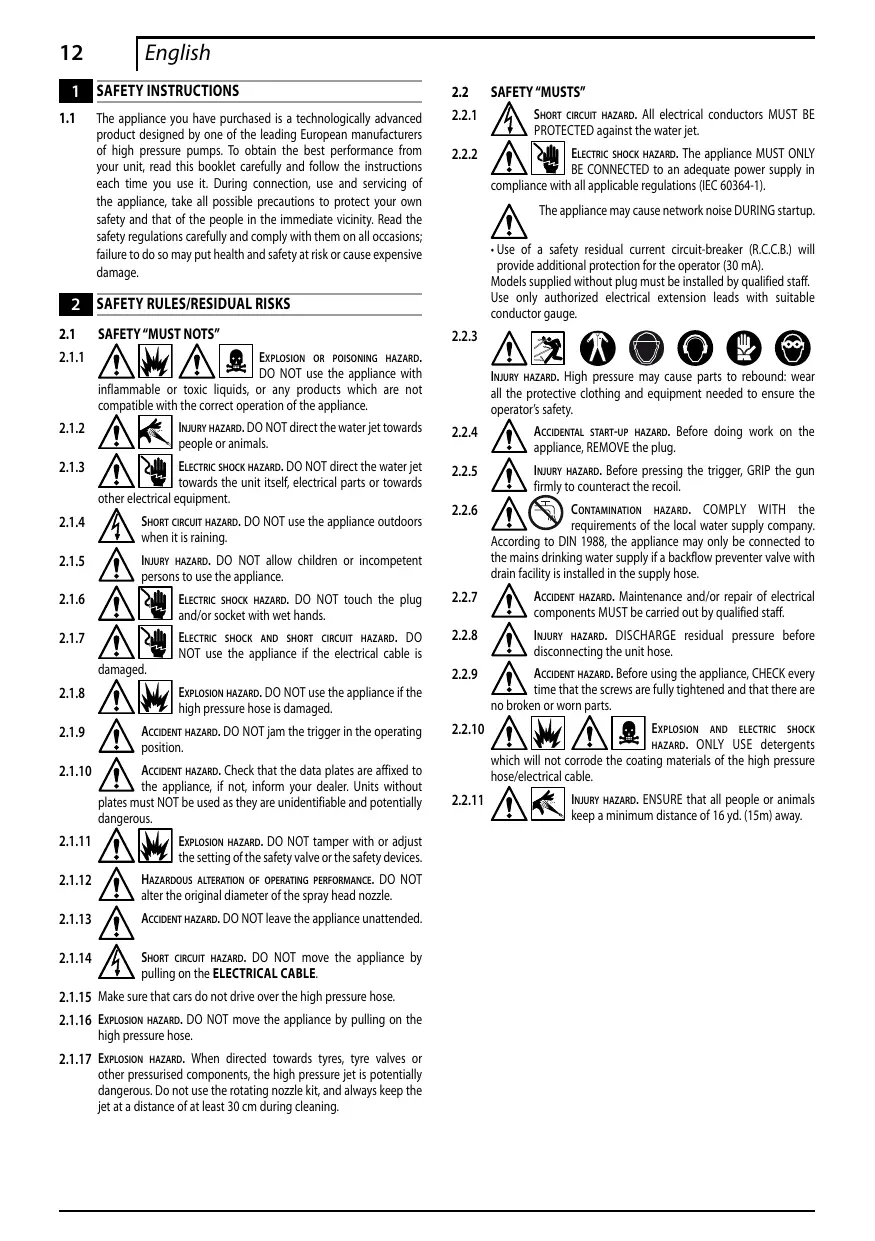 The appliance you have purchased is a technologically advanced product designed by one of the leading European manufacturers of high pressure pumps. To obtain the best performance from your unit, read this booklet carefully and follow the instructions each time you use it. During connection, use and servicing of the appliance, take all possible precautions to protect your own safety and that of the people in the immediate vicinity. Read the safety regulations carefully and comply with them on all occasions; failure to do so may put health and safety at risk or cause expensive damage.