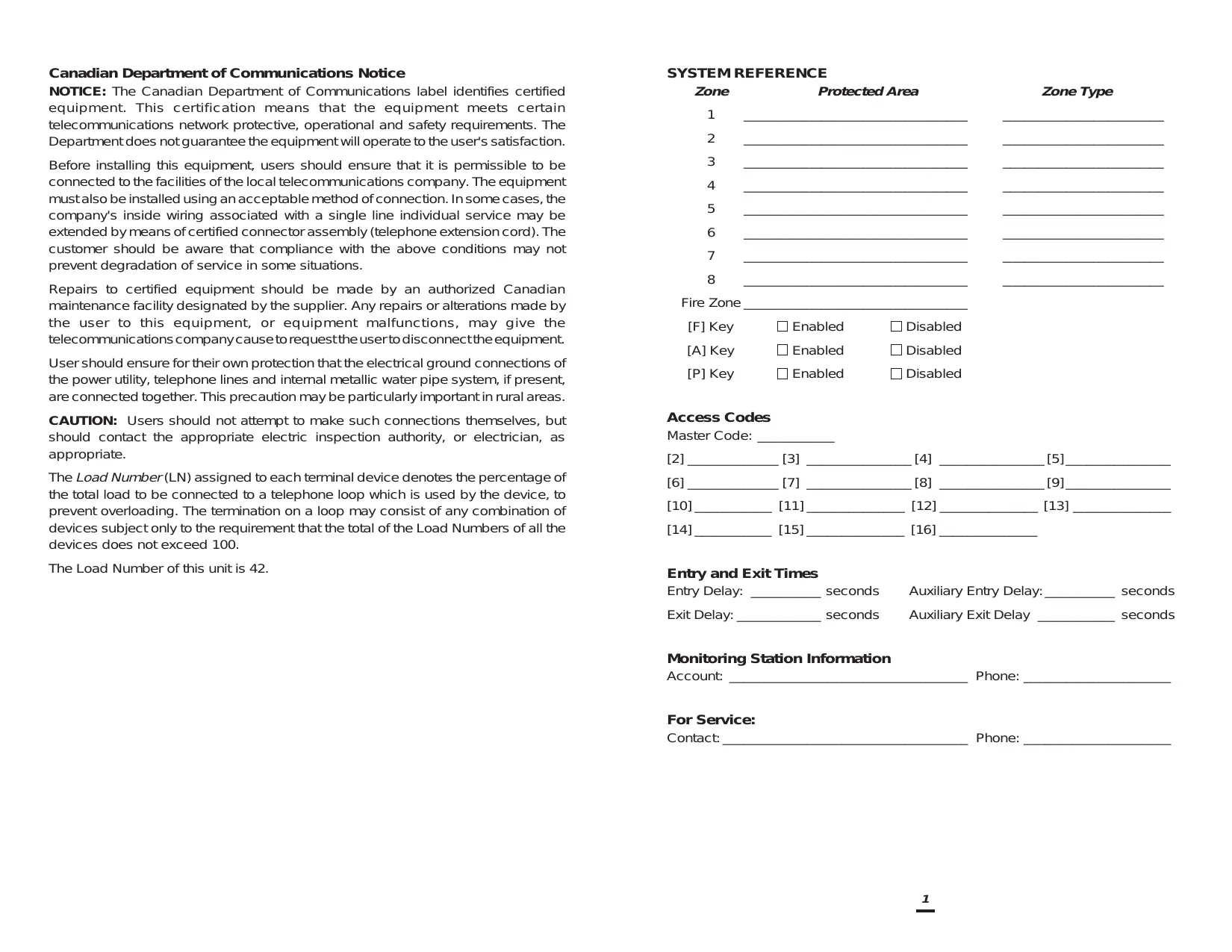 Canadian Department of Communications Notice NOTICE: The Canadian Department of Communications label identifies certified equipment. This certification means that the equipment meets certain telecommunications network protective, operational and safety requirements. The Department does not guarantee the equipment will operate to the user's satisfaction. Before installing this equipment, users should ensure that it is permissible to be connected to the facilities of the local telecommunications company. The equipment mustalso be installed using an acceptable method of connection. Insome cases, the company's inside wiring associated with a single line individual service may be extended by means of certified connector assembly (telephone extension cord). The customer should be aware that compliance with the above conditions may not prevent degradation of service in some situations. Repairs to certified equipment should be made by an authorized Canadian maintenance facility designated by the supplier. Any repairs or alterations made by the user to this equipment, or equipment malfunctions, may give the telecommunications company cause to requestthe usertodisconnectthe equipment. User should ensure for their own protection that the electrical ground connections of the power utility, telephone lines and intemal metallic water pipe system, if present, are connected together. This precaution may be particularly important in rural areas. CAUTION: Users should not attempt to make such connections themselves, but should contact the appropriate electric inspection authority, or electrician, as appropriate. The Load Number(LN) assigned to each terminal device denotes the percentage of the total load to be connected to a telephone loop which is used by the device, to prevent overloading. The termination on à loop may consist of any combination of devices subject only to the requirement that the total of the Load Numbers of all the devices does not exceed 100. The Load Number of this unit is 42. SYSTEM REFERENCE Zone Protected Area Zone Type