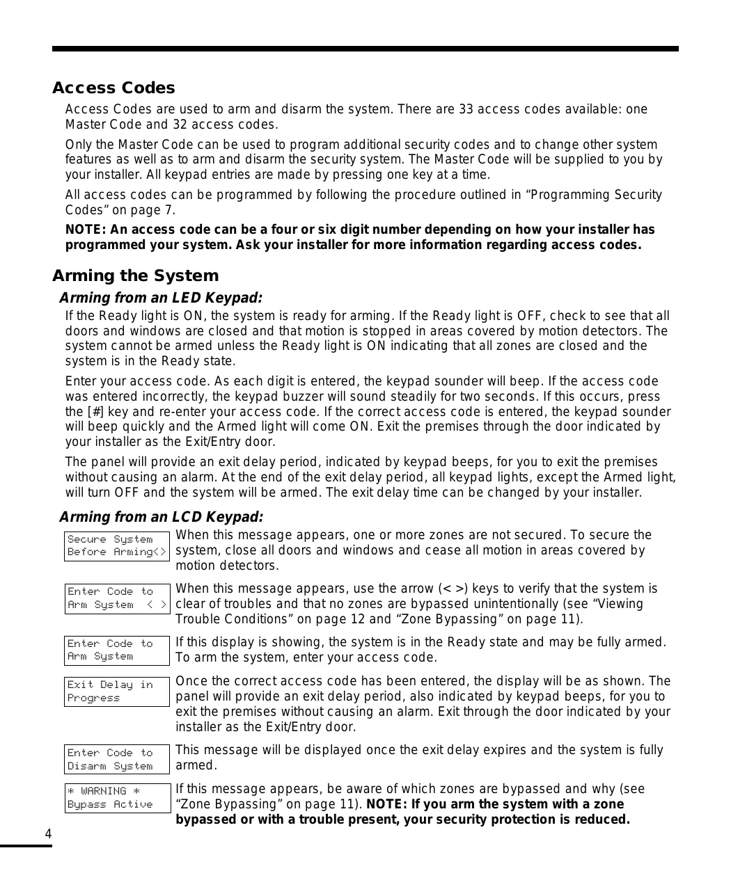 Access Codes Access Codes are used to arm and disarm the system. There are 33 access codes available: one Master Code and 32 access codes Only the Master Code can be used to program additional security codes and to change other system features as well as to arm and disarm the security system. The Master Code will be supplied to you by your installer. All keypad entries are made by pressing one key at a time. All access codes can be programmed by following the procedure outlined in “Programming Security Codes” on page 7. NOTE: An access code can be a four or six digit number depending on how your installer has programmed your system. Ask your installer for more information regarding access codes. Arming the System Arming from an LED Keypad: Ifthe Ready light is ON, the system is ready for arming. If the Ready light is OFF, check to see that all doors and windows are closed and that motion is stopped in areas covered by motion detectors. The system cannot be armed unless the Ready light is ON indicating that all zones are closed and the system is in the Ready state. Enter your access code. As each digit is entered, the keypad sounder will beep. If the access code was entered incorrectly, the keypad buzzer will sound steadily for two seconds. Ifthis occurs, press the [#] key and re-enter your access code. Ifthe correct access code is entered, the keypad sounder will beep quickly and the Armed light will come ON. Exitthe premises through the door indicated by your installer as the Exit/Entry door. The panel will provide an exit delay period, indicated by keypad beeps, for you to exit the premises without causing an alarm. At the end of the exit delay period, all keypad lights, exceptthe Armed light, will turn OFF and the system will be armed. The exit delay time can be changed by your installer. Arming from an LCD Keypad: Secure system | When this message appears, one or more zones are not secured. To secure the Before firming<>| system, close all doors and windows and cease all motion in areas covered by motion detectors Enter Code to | When this message appears, use the arrow (< >) keys to verify that the system is firm System < >| clear of troubles and that no zones are bypassed unintentionally (see “Viewing Trouble Conditions” on page 12 and “Zone Bypassing” on page 11). Enter Code te | lfthis display is showing, the system is in the Ready state and may be fully armed. Ari To arm the system, enter your access code. Exit Delay in | Once the correct access code has been entered, the display will be as shown. The panel will provide an exit delay period, also indicated by keypad beeps, for you to exitthe premises without causing an alarm. Exit through the door indicated by your installer as the Exit/Entry door. Enter Code te | This message will be displayed once the exit delay expires and the system is fully Disarm S armed.