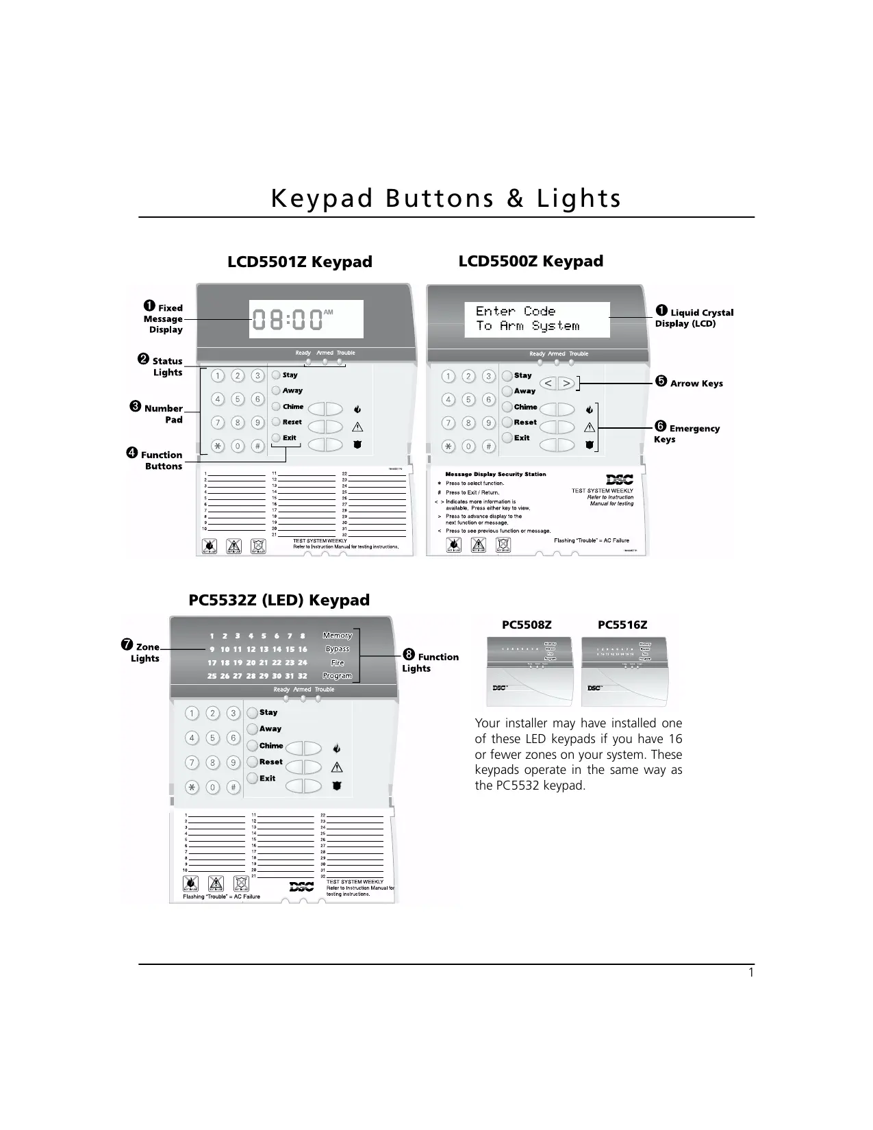 (11 Displays (LCD Keypads): Fixed Message Display (LCD5501Z Keypad) Shows the status of your security system using an LCD showing fixed words/icons and numbers. The display is described below. Zone(s) open roule display OPEN 12345678 Memory) fi ACCES ALAN 5 May À Dear chimeison EE] Sem Sen Ps sed Fe none Liquid Crystal Display (LCD5500Z Keypad) The LCD shows prompts and system information on two 16-character lines. Press the Œ][> keys on the number pad as prompted by the LCD to view alarms or troubles, to arm and disarm the system and to bypass zones. [2] Status Lights (AIl Keypads): Ready Light If the Ready light is ON, the system is ready for arm- ing. The system cannot be armed unless the Ready light is ON (see “Getting Ready to Arm Your System” on page 6). Armed Light If the Armed light is ON, the system has been armed successfully. Trouble Light A flashing Trouble Light indicates AC Trouble. If the Trouble light is ON, see “dentifying Trouble Condi- tions” on page 17. [3] Number Pad (All Keypads): To select a function press {&). To exit a function and return to the Ready state, press @: [4] Function Buttons (AIl Keypads): If your installer has enabled them, you can use the function buttons to access the Stay arm, Away arm, door chime, sensor reset and quick exit features by pressing and holding a button for two seconds. Refer to the manual for more information on these features. (5) Arrow Keys (LCD5500Z Keypad Only): If “< >" appears, more information can be accessed by using the GE keys. Press €] to see the pre- vious function or item of information. Press [>> to advance the display to the next function or item of information. (6) Emergency Keys (All Keypads): Press both à: keys for two seconds to send a Fire message. Press both /\ * Keys for two seconds to send an Auxiliary message. Press both # * Keys for two seconds to send a Panic message. IMPORTANT: * (Al! Keypads) The Fire, Auxiliary and Panic keys will NOT function unless pro- grammed by the installer. If these keys are in ser- vice and the installer has enabled audible feedback, holding down the key for two seconds will cause the keypad sounder to beep indicating that the input has been accepted and sent. (7 Zone Lights (PC55XXZ Keypads): The system uses the zone lights to indicate zone alarms, troubles, alarms in memory, and to aid pro- gramming. © runction Indicators (LCD5501Z and PC55XXZ Keypadbs): Memory Upon disarming, if an alarm has occurred while the system was armed, the Memory indicator will turn on (See “Viewing Alarms in Memory“ on page 13). Bypass If the Bypass indicator is ON, one or more zones are bypassed (See “Bypassing Zones“ on page 15). Fire If the Fire indicator is on, a fire alarm has occurred (See “Fire Alarms" on page 12). Program The Program indicator will flash when you are pro- gramming access codes, or performing other pro- gramming functions. If someone is programming at another keypad, the Program indicator will turn ON to indicate that the system is busy. IMPORTANT: Test system weekly and have any system trouble conditions corrected by your alarm installer.