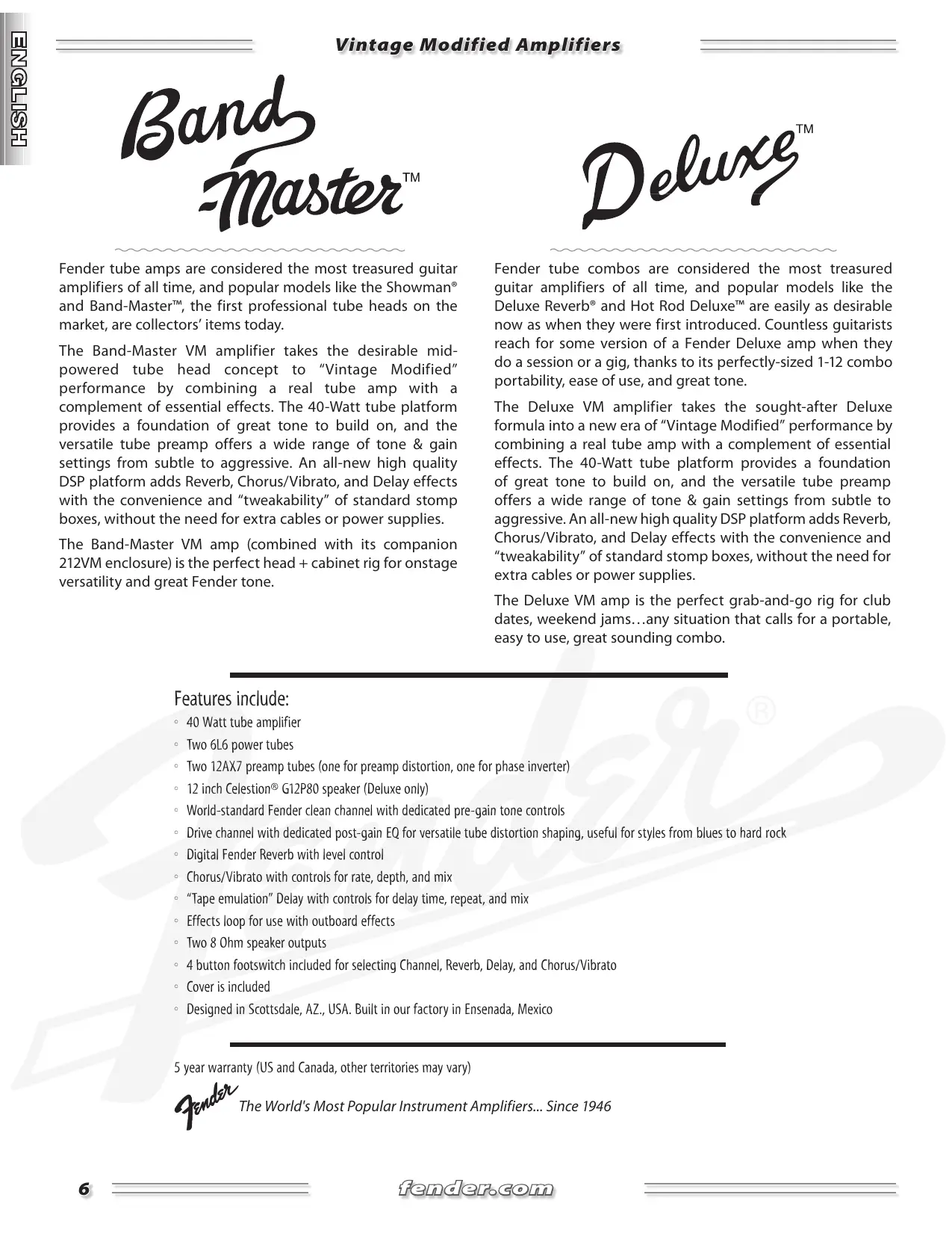 FENDER MUSICAL INSTRUMENTS CORPORATION CORONA, CALIFORNIA USA Fender®, Bandmaster™, and Deluxe™ are trademarks of FMIC. Other trademarks are property of their respective owners. © 2008 FMIC. All rights reserved.