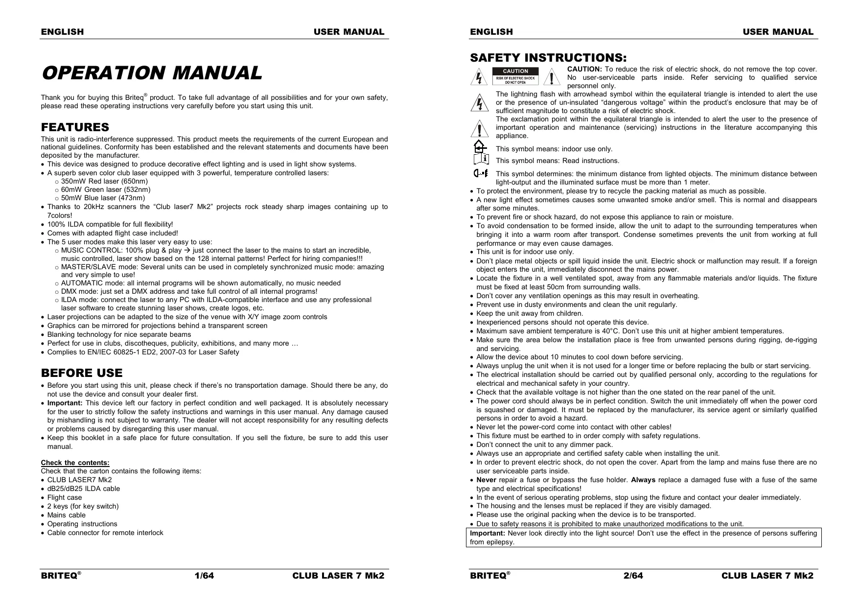 Before you start using this unit, please check if there’s no transportation damage. Should there be any, do not use the device and consult your dealer first. Important: This device left our factory in perfect condition and well packaged. It is absolutely necessary for the user to strictly follow the safety instructions and warnings in this user manual. Any damage caused by mishandling is not subject to warranty. The dealer will not accept responsibility for any resulting defects or problems caused by disregarding this user manual. Keep this booklet in a safe place for future consultation. If you sell the fixture, be sure to add this user manual. Check the contents: Check that the carton contains the following items: CLUB LASER7 Mk2 dB25/dB25 ILDA cable Flight case 2 keys (for key switch) Mains cable Operating instructions Cable connector for remote interlock
