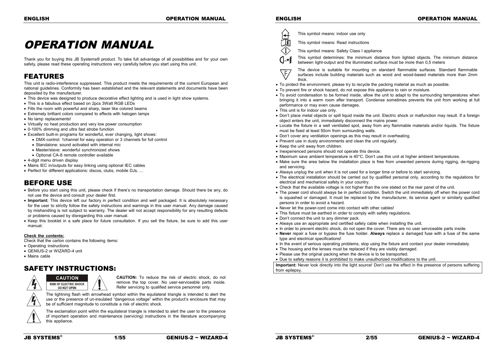 This symbol means: indoor use only OPERATION MANUAL This symbol means: Read instructions Thank you for buying this JB Systems® product. To take full advantage of all possibilities and for your own safety, please read these operating instructions very carefully before you start using this unit. This symbol determines: the minimum distance from lighted objects. The minimum distance between light-output and the illuminated surface must be more than 0,5 meters This symbol means: Safety Class I appliance FEATURES This unit is radio-interference suppressed. This product meets the requirements of the current European and national guidelines. Conformity has been established and the relevant statements and documents have been deposited by the manufacturer. This device was designed to produce decorative effect lighting and is used in light show systems. This is a fabulous effect based on 2pcs 3Watt RGB LEDs Fills the room with powerful and sharp, laser like colored beams Extremely brilliant colors compared to effects with halogen lamps No lamp replacements! Virtually no heat production and very low power consumption 0-100% dimming and ultra fast strobe function Excellent built-in programs for wonderful, ever changing, light shows: DMX-control: 1channel for easy operation or 3 channels for full control Standalone: sound activated with internal mic Master/slave: wonderful synchronized shows Optional CA-8 remote controller available 4-digit menu driven display Mains IEC in/outputs for easy linking using optional IEC cables Perfect for different applications: discos, clubs, mobile DJs, ... BEFORE USE Before you start using this unit, please check if there’s no transportation damage. Should there be any, do not use the device and consult your dealer first. Important: This device left our factory in perfect condition and well packaged. It is absolutely necessary for the user to strictly follow the safety instructions and warnings in this user manual. Any damage caused by mishandling is not subject to warranty. The dealer will not accept responsibility for any resulting defects or problems caused by disregarding this user manual. Keep this booklet in a safe place for future consultation. If you sell the fixture, be sure to add this user manual. Check the contents: Check that the carton contains the following items: Operating instructions GENIUS-2 or WIZARD-4 unit Mains cable SAFETY INSTRUCTIONS: CAUTION The device is suitable for mounting on standard flammable surfaces. Standard flammable surfaces include building materials such as wood and wood-based materials more than 2mm thick. To protect the environment, please try to recycle the packing material as much as possible. To prevent fire or shock hazard, do not expose this appliance to rain or moisture. To avoid condensation to be formed inside, allow the unit to adapt to the surrounding temperatures when bringing it into a warm room after transport. Condense sometimes prevents the unit from working at full performance or may even cause damages. This unit is for indoor use only. Don’t place metal objects or spill liquid inside the unit. Electric shock or malfunction may result. If a foreign object enters the unit, immediately disconnect the mains power. Locate the fixture in a well ventilated spot, away from any flammable materials and/or liquids. The fixture must be fixed at least 50cm from surrounding walls. Don’t cover any ventilation openings as this may result in overheating. Prevent use in dusty environments and clean the unit regularly. Keep the unit away from children. Inexperienced persons should not operate this device. Maximum save ambient temperature is 40°C. Don’t use this unit at higher ambient temperatures. Make sure the area below the installation place is free from unwanted persons during rigging, de-rigging and servicing. Always unplug the unit when it is not used for a longer time or before to start servicing. The electrical installation should be carried out by qualified personal only, according to the regulations for electrical and mechanical safety in your country. Check that the available voltage is not higher than the one stated on the rear panel of the unit. The power cord should always be in perfect condition. Switch the unit immediately off when the power cord is squashed or damaged. It must be replaced by the manufacturer, its service agent or similarly qualified persons in order to avoid a hazard. Never let the power-cord come into contact with other cables! This fixture must be earthed in order to comply with safety regulations. Don’t connect the unit to any dimmer pack. Always use an appropriate and certified safety cable when installing the unit. In order to prevent electric shock, do not open the cover. There are no user serviceable parts inside. Never repair a fuse or bypass the fuse holder. Always replace a damaged fuse with a fuse of the same type and electrical specifications! In the event of serious operating problems, stop using the fixture and contact your dealer immediately. The housing and the lenses must be replaced if they are visibly damaged. Please use the original packing when the device is to be transported. Due to safety reasons it is prohibited to make unauthorized modifications to the unit. Important: Never look directly into the light source! Don’t use the effect in the presence of persons suffering from epilepsy. CAUTION: To reduce the risk of electric shock, do not remove the top cover. No user-serviceable parts inside. Refer servicing to qualified service personnel only. The lightning flash with arrowhead symbol within the equilateral triangle is intended to alert the use or the presence of un-insulated “dangerous voltage” within the product’s enclosure that may be of sufficient magnitude to constitute a risk of electric shock. The exclamation point within the equilateral triangle is intended to alert the user to the presence of important operation and maintenance (servicing) inst