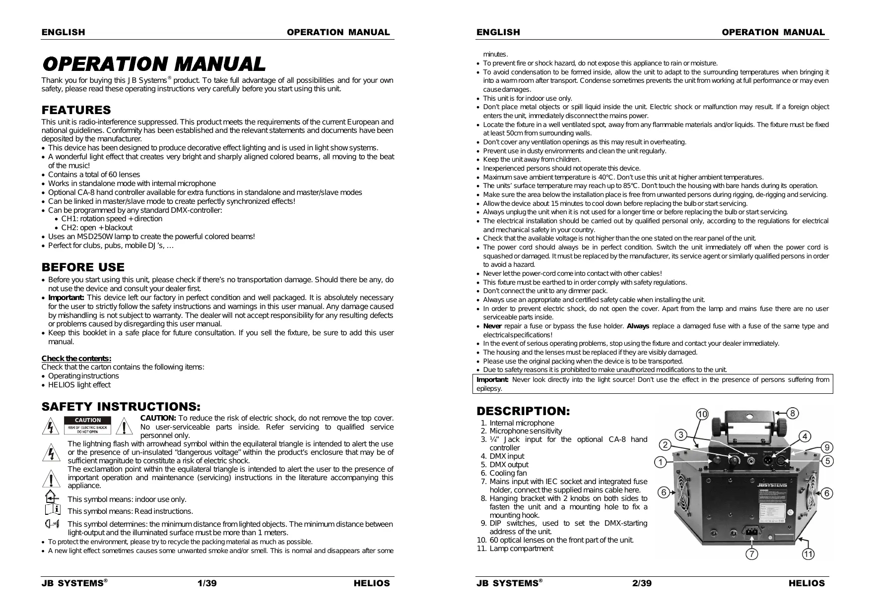 Thank you for buying this JB Systems product. To take full advantage of all possibilities and for your own safety, please read these operating instructions very carefully before you start using this unit. FEATURES This unit is radio-interference suppressed. This product meets the requirements of the current European and national guidelines. Conformity has been established and the relevant statements and documents have been deposited by the manufacturer. This device has been designed to produce decorative effect lighting and is used in light show systems. A wonderful light effect that creates very bright and sharply aligned colored beams, all moving to the beat of the music! Contains a total of 60 lenses Works in standalone mode with internal microphone Optional CA-8 hand controller available for extra functions in standalone and master/slave modes Can be linked in master/slave mode to create perfectly synchronized effects! Can be programmed by any standard DMX-controller: CH1: rotation speed + direction CH2: open + blackout Uses an MSD250W lamp to create the powerful colored beams! Perfect for clubs, pubs, mobile DJ’s, … BEFORE USE Before you start using this unit, please check if there’s no transportation damage. Should there be any, do not use the device and consult your dealer first. Important: This device left our factory in perfect condition and well packaged. It is absolutely necessary for the user to strictly follow the safety instructions and warnings in this user manual. Any damage caused by mishandling is not subject to warranty. The dealer will not accept responsibility for any resulting defects or problems caused by disregarding this user manual. Keep this booklet in a safe place for future consultation. If you sell the fixture, be sure to add this user manual. Check the contents: Check that the carton contains the following items: Operating instructions HELIOS light effect SAFETY INSTRUCTIONS: CAUTION: To reduce the risk of electric shock, do not remove the top cover. No user-serviceable parts inside. Refer servicing to qualified service personnel only. The lightning flash with arrowhead symbol within the equilateral triangle is intended to alert the use or the presence of un-insulated “dangerous voltage” within the product’s enclosure that may be of sufficient magnitude to constitute a risk of electric shock. The exclamation point within the equilateral triangle is intended to alert the user to the presence of important operation and maintenance (servicing) instructions in the literature accompanying this appliance. CAUTION ENGLISH OPERATION MANUAL minutes. To prevent fire or shock hazard, do not expose this appliance to rain or moisture. To avoid condensation to be formed inside, allow the unit to adapt to the surrounding temperatures when bringing it into a warm room after transport. Condense sometimes prevents the unit from working at full performance or may even cause damages. This unit is for indoor use only. Don’t place metal objects or spill liquid inside the unit. Electric shock or malfunction may result. If a foreign object enters the unit, immediately disconnect the mains power. Locate the fixture in a well ventilated spot, away from any flammable materials and/or liquids. The fixture must be fixed at least 50cm from surrounding walls. Don’t cover any ventilation openings as this may result in overheating. Prevent use in dusty environments and clean the unit regularly. Keep the unit away from children. Inexperienced persons should not operate this device. Maximum save ambient temperature is 40°C. Don’t use this unit at higher ambient temperatures. The units’ surface temperature may reach up to 85°C. Don’t touch the housing with bare hands during its operation. Make sure the area below the installation place is free from unwanted persons during rigging, de-rigging and servicing. Allow the device about 15 minutes to cool down before replacing the bulb or start servicing. Always unplug the unit when it is not used for a longer time or before replacing the bulb or start servicing. The electrical installation should be carried out by qualified personal only, according to the regulations for electrical and mechanical safety in your country. Check that the available voltage is not higher than the one stated on the rear panel of the unit. The power cord should always be in perfect condition. Switch the unit immediately off when the power cord is squashed or damaged. It must be replaced by the manufacturer, its service agent or similarly qualified persons in order to avoid a hazard. Never let the power-cord come into contact with other cables! This fixture must be earthed to in order comply with safety regulations. Don’t connect the unit to any dimmer pack. Always use an appropriate and certified safety cable when installing the unit. In order to prevent electric shock, do not open the cover. Apart from the lamp and mains fuse there are no user serviceable parts inside. Never repair a fuse or bypass the fuse holder. Always replace a damaged fuse with a fuse of the same type and electricalspecifications! In the event of serious operating problems, stop using the fixture and contact your dealer immediately. The housing and the lenses must be replaced if they are visibly damaged. Please use the original packing when the device is to be transported. Due to safety reasons it is prohibited to make unauthorized modifications to the unit. Important: Never look directly into the light source! Don’t use the effect in the presence of persons suffering from epilepsy. DESCRIPTION: To protect the environment, please try to recycle the packing material as much as possible. A new light effect sometimes causes some unwanted smoke and/or smell. This is normal and disappears after some