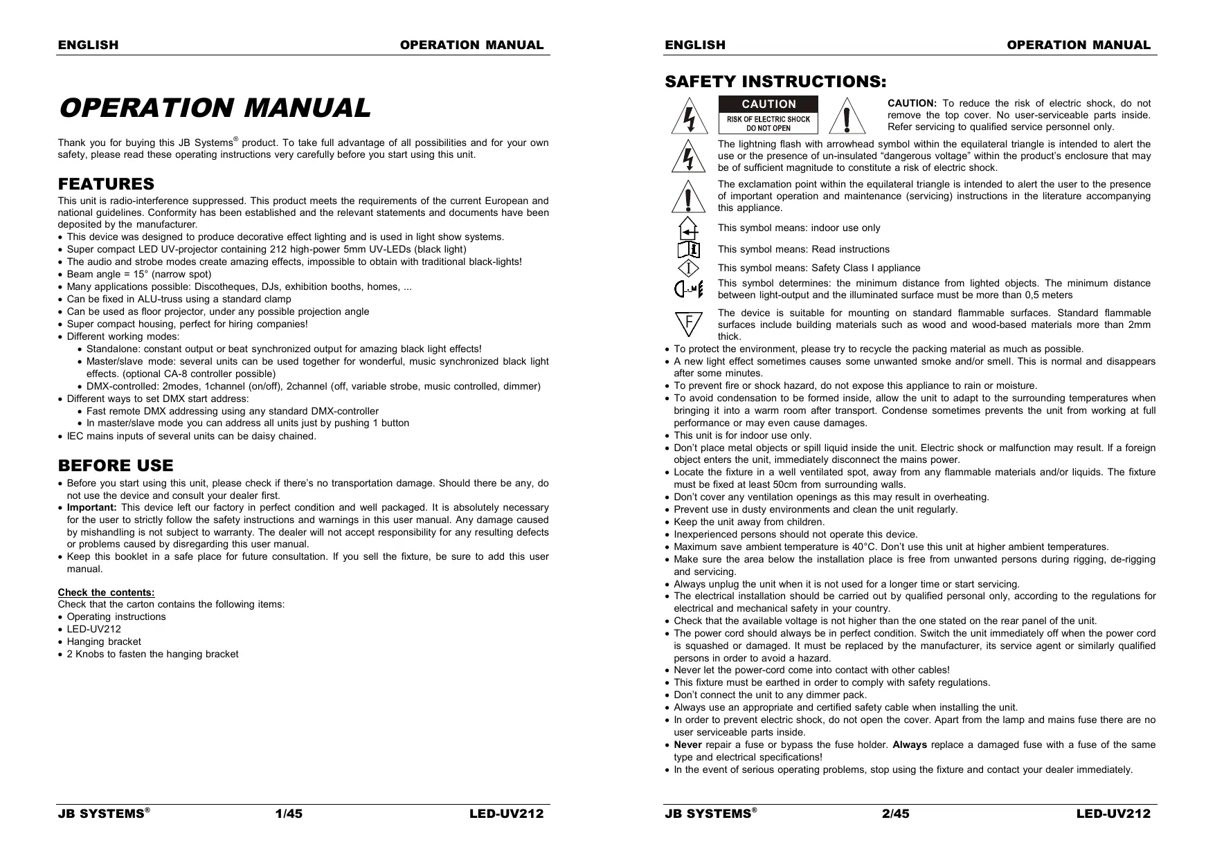 Dispose of the unit and used batteries in an environment friendly manner according to your country regulations. Thank you for buying this JB Systems product. To take full advantage of all possibilities and for your own safety, please read these operating instructions very carefully before you start using this unit. This unit is radio-interference suppressed. This product meets the requirements of the current European and national guidelines. Conformity has been established and the relevant statements and documents have been deposited by the manufacturer. This device was designed to produce decorative effect lighting and is used in light show systems. Super compact LED UV-projector containing 212 high-power 5mm UV-LEDs (black light) The audio and strobe modes create amazing effects, impossible to obtain with traditional black-lights! Beam angle = 15° (narrow spot) Many applications possible: Discotheques, DJs, exhibition booths, homes, ... Can be fixed in ALU-truss using a standard clamp Can be used as floor projector, under any possible projection angle Super compact housing, perfect for hiring companies! Different working modes: Standalone: constant output or beat synchronized output for amazing black light effects! Master/slave mode: several units can be used together for wonderful, music synchronized black light effects. (optional CA-8 controller possible) DMX-controlled: 2modes, 1channel (on/off), 2channel (off, variable strobe, music controlled, dimmer) Different ways to set DMX start address: Fast remote DMX addressing using any standard DMX-controller In master/slave mode you can address all units just by pushing 1 button IEC mains inputs of several units can be daisy chained. BEFORE USE Before you start using this unit, please check if there’s no transportation damage. Should there be any, do not use the device and consult your dealer first. Important: This device left our factory in perfect condition and well packaged. It is absolutely necessary for the user to strictly follow the safety instructions and warnings in this user manual. Any damage caused by mishandling is not subject to warranty. The dealer will not accept responsibility for any resulting defects or problems caused by disregarding this user manual. Keep this booklet in a safe place for future consultation. If you sell the fixture, be sure to add this user manual. The exclamation point within the equilateral triangle is intended to alert the user to the presence of important operation and maintenance (servicing) instructions in the literature accompanying this appliance. This symbol means: indoor use only This symbol means: Read instructions This symbol means: Safety Class I appliance This symbol determines: the minimum distance from lighted objects. The minimum distance between light-output and the illuminated surface must be more than 0,5 meters Check the contents: Check that the carton contains the following items: Operating instructions LED-UV212 Hanging bracket 2 Knobs to fasten the hanging bracket CAUTION: To reduce the risk of electric shock, do not remove the top cover. No user-serviceable parts inside. Refer servicing to qualified service personnel only. The lightning flash with arrowhead symbol within the equilateral triangle is intended to alert the use or the presence of un-insulated “dangerous voltage” within the product’s enclosure that may be of sufficient magnitude to constitute a risk of electric shock. FEATURES JB SYSTEMS® OPERATION MANUAL The device is suitable for mounting on standard flammable surfaces. Standard flammable surfaces include building materials such as wood and wood-based materials more than 2mm thick. To protect the environment, please try to recycle the packing material as much as possible. A new light effect sometimes causes some unwanted smoke and/or smell. This is normal and disappears after some minutes. To prevent fire or shock hazard, do not expose this appliance to rain or moisture. To avoid condensation to be formed inside, allow the unit to adapt to the surrounding temperatures when bringing it into a warm room after transport. Condense sometimes prevents the unit from working at full performance or may even cause damages. This unit is for indoor use only. Don’t place metal objects or spill liquid inside the unit. Electric shock or malfunction may result. If a foreign object enters the unit, immediately disconnect the mains power. Locate the fixture in a well ventilated spot, away from any flammable materials and/or liquids. The fixture must be fixed at least 50cm from surrounding walls. Don’t cover any ventilation openings as this may result in overheating. Prevent use in dusty environments and clean the unit regularly. Keep the unit away from children. Inexperienced persons should not operate this device. Maximum save ambient temperature is 40°C. Don’t use this unit at higher ambient temperatures. Make sure the area below the installation place is free from unwanted persons during rigging, de-rigging and servicing. Always unplug the unit when it is not used for a longer time or start servicing. The electrical installation should be carried out by qualified personal only, according to the regulations for electrical and mechanical safety in your country. Check that the available voltage is not higher than the one stated on the rear panel of the unit. The power cord should always be in perfect condition. Switch the unit immediately off when the power cord is squashed or damaged. It must be replaced by the manufacturer, its service agent or similarly qualified persons in order to avoid a hazard. Never let the power-cord come into contact with other cables! This fixture must be earthed in order to comply with safety regulations. Don’t connect the unit to any dimmer pack. Always use an appropriate and certified safety cable when installing the unit. In order to prevent electric shock, do not open the cover. Apart from the lamp and mains fuse there are no us