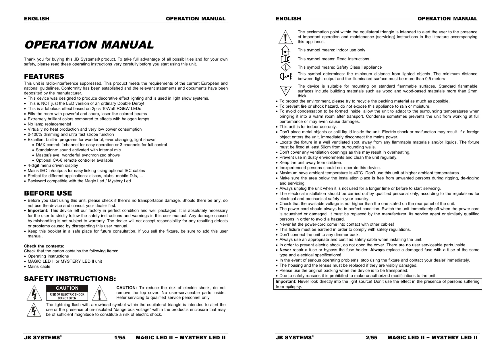Tente reciclar a unidade e as pilhas usadas respeitando o ambiente e em conformidade com as normas vigentes no seu país. ENGLISH OPERATION MANUAL OPERATION MANUAL ENGLISH OPERATION MANUAL The exclamation point within the equilateral triangle is intended to alert the user to the presence of important operation and maintenance (servicing) instructions in the literature accompanying this appliance. This symbol means: indoor use only Thank you for buying this JB Systems® product. To take full advantage of all possibilities and for your own safety, please read these operating instructions very carefully before you start using this unit. This symbol means: Read instructions FEATURES This symbol determines: the minimum distance from lighted objects. The minimum distance between light-output and the illuminated surface must be more than 0,5 meters This unit is radio-interference suppressed. This product meets the requirements of the current European and national guidelines. Conformity has been established and the relevant statements and documents have been deposited by the manufacturer. This device was designed to produce decorative effect lighting and is used in light show systems. This is NOT just the LED version of an ordinary Double Derby! This is a fabulous effect based on 2pcs 10Watt RGBW LEDs Fills the room with powerful and sharp, laser like colored beams Extremely brilliant colors compared to effects with halogen lamps No lamp replacements! Virtually no heat production and very low power consumption 0-100% dimming and ultra fast strobe function Excellent built-in programs for wonderful, ever changing, light shows: DMX-control: 1channel for easy operation or 3 channels for full control Standalone: sound activated with internal mic Master/slave: wonderful synchronized shows Optional CA-8 remote controller available 4-digit menu driven display Mains IEC in/outputs for easy linking using optional IEC cables Perfect for different applications: discos, clubs, mobile DJs, ... Backward compatible with the Magic Led / Mystery Led BEFORE USE Before you start using this unit, please check if there’s no transportation damage. Should there be any, do not use the device and consult your dealer first. Important: This device left our factory in perfect condition and well packaged. It is absolutely necessary for the user to strictly follow the safety instructions and warnings in this user manual. Any damage caused by mishandling is not subject to warranty. The dealer will not accept responsibility for any resulting defects or problems caused by disregarding this user manual. Keep this booklet in a safe place for future consultation. If you sell the fixture, be sure to add this user manual. Check the contents: Check that the carton contains the following items: Operating instructions MAGIC LED II or MYSTERY LED II unit Mains cable SAFETY INSTRUCTIONS: CAUTION CAUTION: To reduce the risk of electric shock, do not remove the top cover. No user-serviceable parts inside. Refer servicing to qualified service personnel only. This symbol means: Safety Class I appliance The device is suitable for mounting on standard flammable surfaces. Standard flammable surfaces include building materials such as wood and wood-based materials more than 2mm thick. To protect the environment, please try to recycle the packing material as much as possible. To prevent fire or shock hazard, do not expose this appliance to rain or moisture. To avoid condensation to be formed inside, allow the unit to adapt to the surrounding temperatures when bringing it into a warm room after transport. Condense sometimes prevents the unit from working at full performance or may even cause damages. This unit is for indoor use only. Don’t place metal objects or spill liquid inside the unit. Electric shock or malfunction may result. If a foreign object enters the unit, immediately disconnect the mains power. Locate the fixture in a well ventilated spot, away from any flammable materials and/or liquids. The fixture must be fixed at least 50cm from surrounding walls. Don’t cover any ventilation openings as this may result in overheating. Prevent use in dusty environments and clean the unit regularly. Keep the unit away from children. Inexperienced persons should not operate this device. Maximum save ambient temperature is 40°C. Don’t use this unit at higher ambient temperatures. Make sure the area below the installation place is free from unwanted persons during rigging, de-rigging and servicing. Always unplug the unit when it is not used for a longer time or before to start servicing. The electrical installation should be carried out by qualified personal only, according to the regulations for electrical and mechanical safety in your country. Check that the available voltage is not higher than the one stated on the rear panel of the unit. The power cord should always be in perfect condition. Switch the unit immediately off when the power cord is squashed or damaged. It must be replaced by the manufacturer, its service agent or similarly qualified persons in order to avoid a hazard. Never let the power-cord come into contact with other cables! This fixture must be earthed in order to comply with safety regulations. Don’t connect the unit to any dimmer pack. Always use an appropriate and certified safety cable when installing the unit. In order to prevent electric shock, do not open the cover. There are no user serviceable parts inside. Never repair a fuse or bypass the fuse holder. Always replace a damaged fuse with a fuse of the same type and electrical specifications! In the event of serious operating problems, stop using the fixture and contact your dealer immediately. The housing and the lenses must be replaced if they are visibly damaged. Please use the original packing when the device is to be transported. Due to safety reasons it is prohibited to make unauthorized modifications to the unit. Important: Never look directly into the li