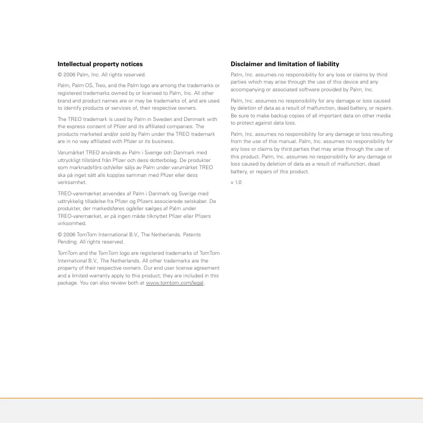 Use your GPS Navigator Car Kit often. Downloaded data is retained for two to three days. You can reduce data download time by frequently using your GPS Navigator Car Kit. NOTE The first time you use your GPS Navigator Car Kit, it may take up to 15 minutes to locate a satellite signal. This is because so much data must be downloaded. Where can I get customer support if I need it? Go to the Palm website at www.palm.com/ support. Important safety and legal information Please read the following information to ensure safe use of your GPS Navigator Car Kit. Global Positioning System The Global Positioning System (GPS) is a satellite-based system that provides location and timing information around the globe. GPS is operated and controlled under the sole responsibility of the Government of the United States of America, which is responsible for its availability and accuracy. Any changes in GPS availability and accuracy may impact the operation of your GPS Navigator Car Kit. Environmental conditions will affect the operation of your GPS Navigator Car Kit. TomTom B.V. and Palm cannot accept any liability for the availability and accuracy of GPS. Use With Care Use of the GPS Navigator Car Kit does not by any means substitute for the need to drive with due care and attention. IMPORTANT Do not mount the GPS Navigator Car Kit where the driver’s field of vision is obscured or where airbags may deploy, and do not place it on the dashboard without securing it reliably. Do not mount the unit or route the cables in such a way as to interfere with control of the vehicle. Failure to follow these guidelines could result in an accident or collision resulting in serious injury or death. Drive safely using information from street signs and landmarks in addition to the GPS Navigator Car Kit. Do not become distracted by the GPS Navigator Car Kit while operating the vehicle. Use voice prompts to minimize the need to look at the display. Do not input destinations or access other functions that take time to complete unless the vehicle is safely stopped. Make all settings before departing or pull off the road in a safe and legal manner if changes need to be made. IMPORTANT Use the GPS Navigator Car Kit only as an aid to navigation. It is not designed for any use requiring precise measurements. The Global Positioning System (GPS) is operated by the government of the United States of America and is subject to changes which could affect the accuracy and performance of this GPS equipment. NOTICE TO DRIVERS When using this product you must obey your local vehicle codes. Some vehicle codes restrict any object or material from being placed, displayed, installed, affixed, or applied upon the windshield or side or rear windows. Where such codes exist, when using this product, the suction cup mount pad should be used instead of attaching the mount directly to the vehicle windshield or side or rear windows. Palm is not responsible for any damages, fines, or penalties that may result from disregarding this notice. Aircraft and Hospitals Use of devices with an antenna is prohibited on most aircraft, in many hospitals, and in many other locations. The GPS Navigator Car Kit must not be used in these environments. Heat-Reflective Shields Some newer-model vehicles may have a heat-reflective shield embedded in the windshield, which may prevent proper GPS signal reception if the GPS Navigator Car Kit is placed behind the windshield. To enable proper reception:
