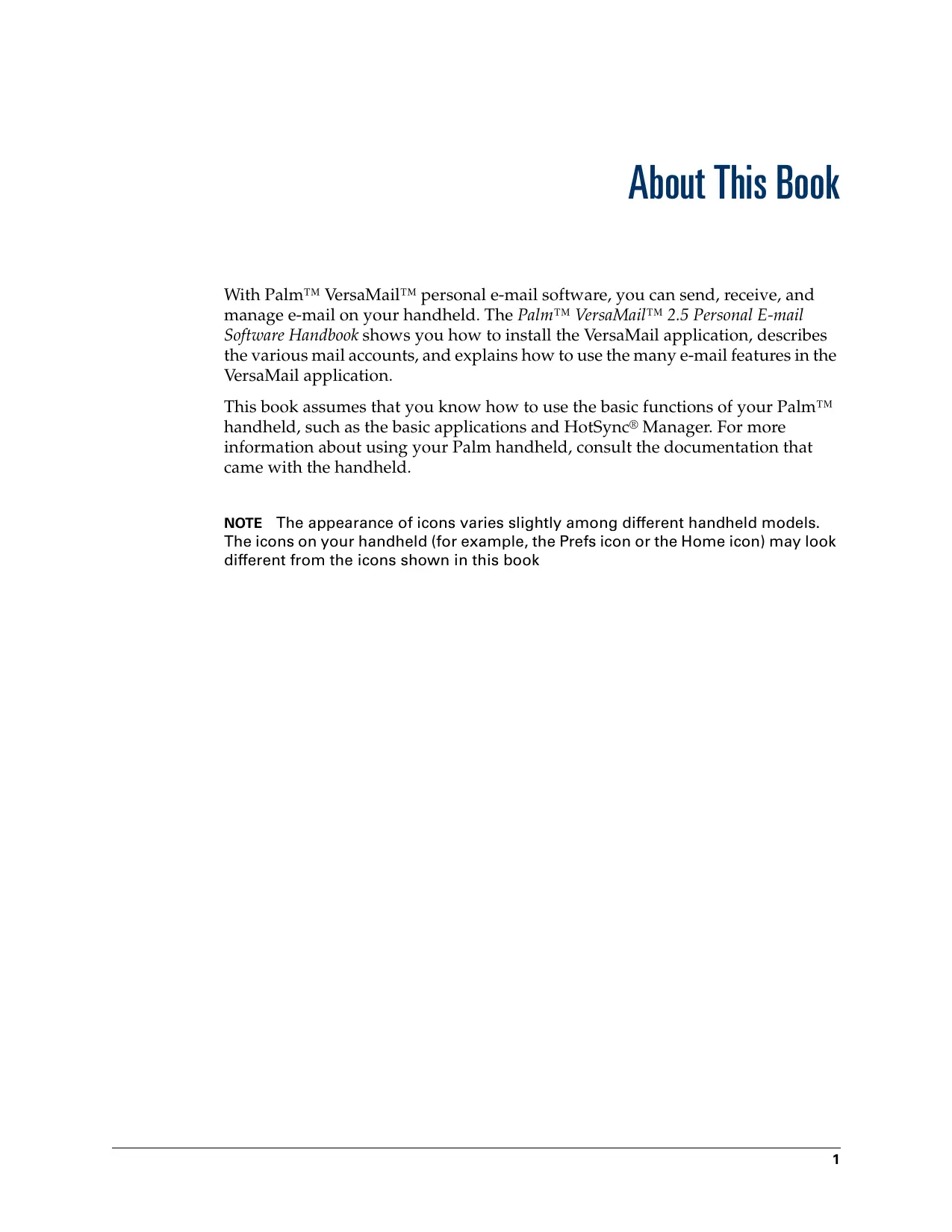 About This Book With Palm" VersaMailTM personal e-mail software, you can send, receive, and manage e-mail on your handheld. The PalmT" VersaMail'M 2.5 Personal E-mail Software Handbook shows you how to install the VersaMail application, describes the various mail accounts, and explains how to use the many e-mail features in the VersaMail application. This book assumes that you know how to use the basic functions of your PalmTM handheld, such as the basic applications and HotSync® Manager. For more information about using your Palm handheld, consult the documentation that came with the handheld. NOTE The appearance of icons varies slightly among different handheld models. The icons on your handheld (for example, the Prefs icon or the Home icon) may look different from the icons shown in this book