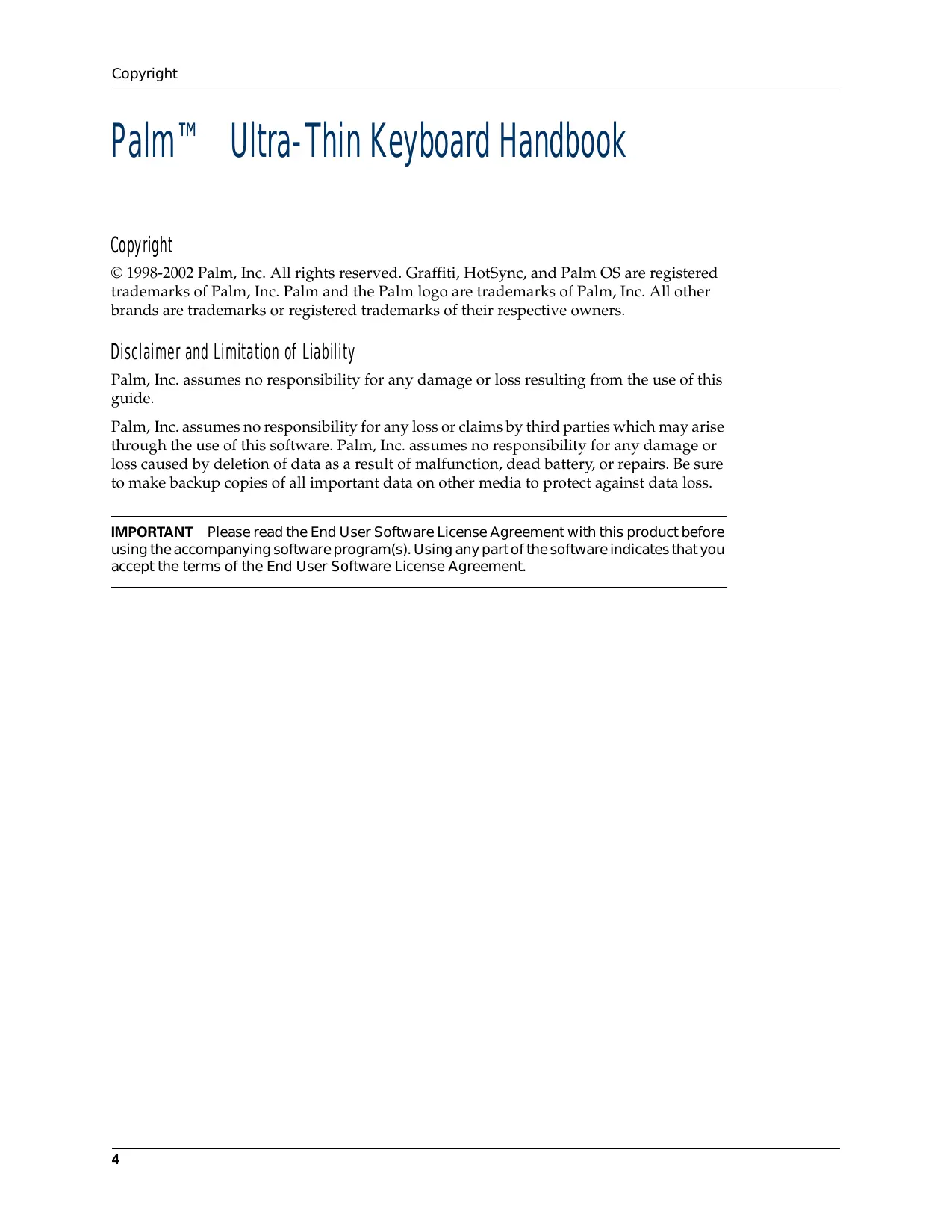 Palm™ Ultra-Thin Keyboard Handbook Copyright © 1998-2002 Palm, Inc. All rights reserved. Graffiti, HotSync, and Palm OS are registered trademarks of Palm, Inc. Palm and the Palm logo are trademarks of Palm, Inc. All other brands are trademarks or registered trademarks of their respective owners. Disclaimer and Limitation of Liability Palm, Inc. assumes no responsibility for any damage or loss resulting from the use of this guide. Palm, Inc. assumes no responsibility for any loss or claims by third parties which may arise through the use of this software. Palm, Inc. assumes no responsibility for any damage or loss caused by deletion of data as a result of malfunction, dead battery, or repairs. Be sure to make backup copies of all important data on other media to protect against data loss. IMPORTANT Please read the End User Software License Agreement with this product before using the accompanying software program(s). Using any part of the software indicates that you accept the terms of the End User Software License Agreement.