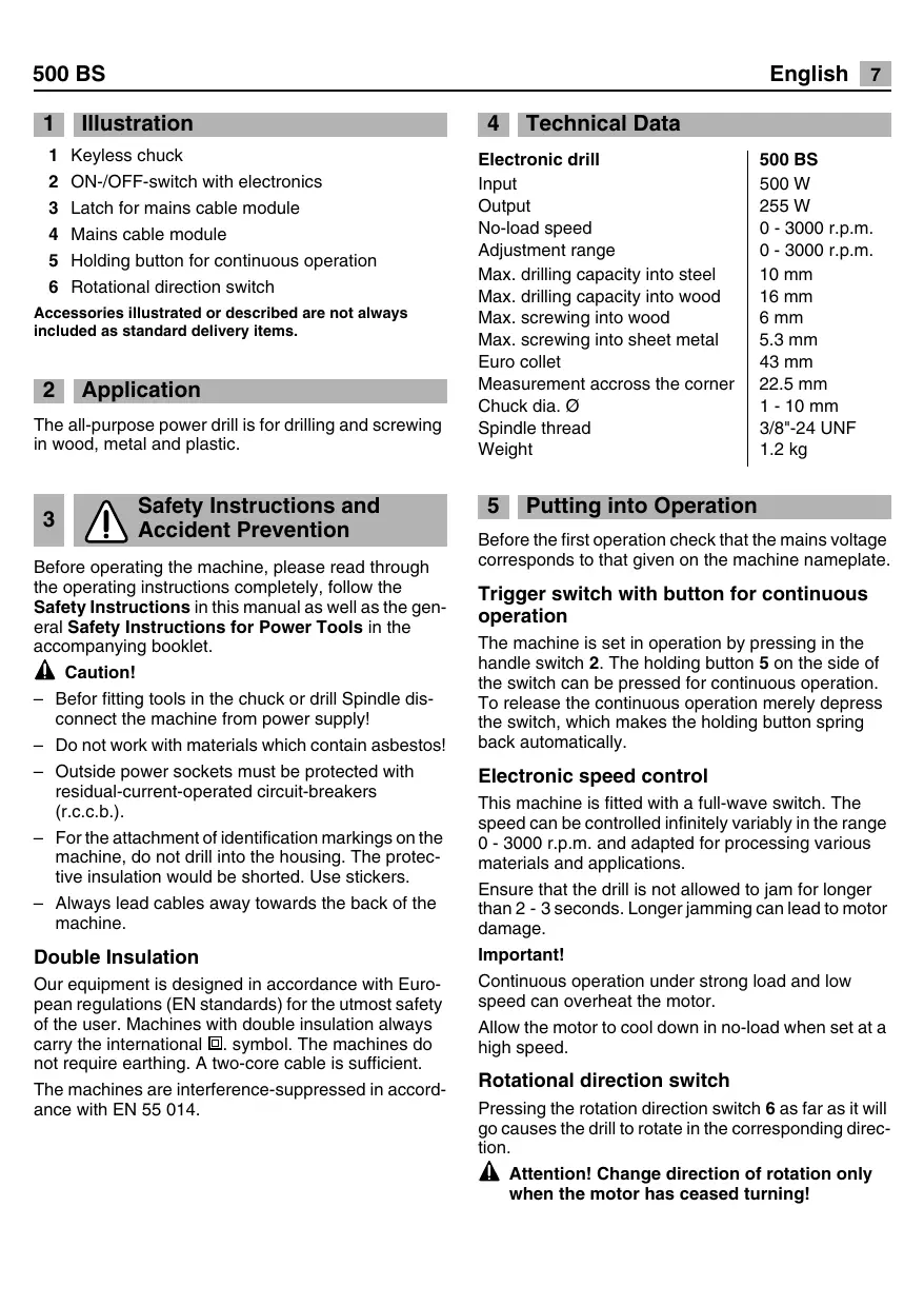 500 BS English =7 1 Illustration 4 Technical Data 1 Keyless chuck Electronic drill 500 BS 2 ON-OFF-switch with electronics Input 500 W 3 Latch for mains cable module Output 255 W 4 Mains cable module No-load speed 0-3000r. 5 Holding button for continuous operation Adjustment range 93000 r. & Rotational direct th Max. driling capacity into steel | 10 mm otational direction switc: Max. drilling capacity into wood | 16 mm Accessories illustrated or described are not always Max. screwing into wood 6 mm included as standard delivery items. Max. screwing into sheet metal | 5.3mm Euro collet 43 mm 2: Application Measurement accross the corner | 22.5 mm Chuck dia. © 1-10 mm The all-purpose power drillis for drilling and screwing Spindle thread 3/8"-24 UNF in wood, metal and plastic. Weight 1.2 kg 3 Safety Instructions and MN Accident Prevention Before operating the machine, please read through the operating instructions completely, follow the Safety Instructions in this manual as well as the gen- ral Safety Instructions for Power Tools in the accompanying booklet. À Caution! Befor fitting tools in the chuck or dril Spindle dis- connect the machine from power supply! — Do not work with materials which contain asbestos! — Outside power sockets must be protected with residual-current-operated circuit-breakers (rc.cb). — Forthe attachment of identification markings on the machine, do not drill into the housing. The protec- tive insulation would be shorted. Use stickers. — Always lead cables away towards the back of the machine. Double Insulation Our equipment is designed in accordance with Euro- pean regulations (EN standards) for the utmost safety ofthe user. Machines with double insulation always carry the international El. symbol. The machines do not require earthing. À two-core cable is sufficient. The machines are interference-suppressed in accord- ance with EN 55 014. 5 Putting into Operation Before the first operation check that the mains voltage corresponds to that given on the machine nameplate. Trigger switch with button for continuous operation The machine is set in operation by pressing in the handle switch 2. The holding button 5 on the side of the switch can be pressed for continuous operation. To release the continuous operation merely depress the switch, which makes the holding button spring back automatically. Electronic speed control This machine is fitted with a full-wave switch. The speed can be controlled infinitely variably in the range