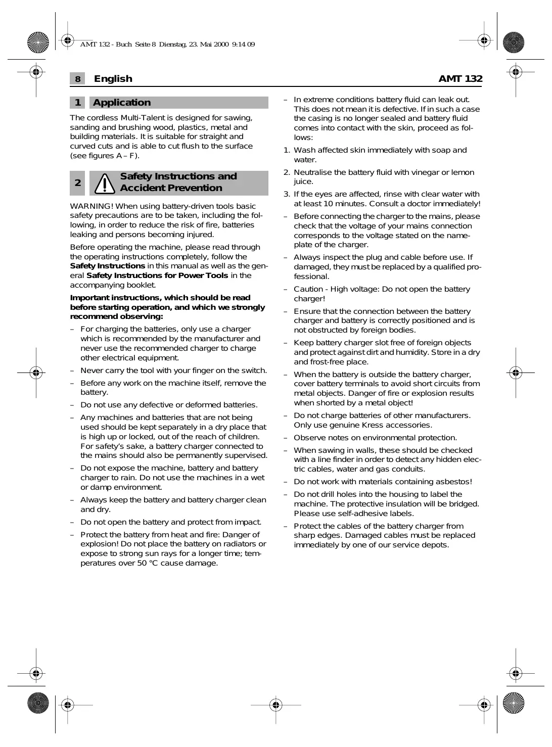 Safety Instructions and Accident Prevention WARNING! When using battery-driven tools basic safety precautions are to be taken, including the following, in order to reduce the risk of fire, batteries leaking and persons becoming injured. Before operating the machine, please read through the operating instructions completely, follow the Safety Instructions in this manual as well as the general Safety Instructions for Power Tools in the accompanying booklet. Important instructions, which should be read before starting operation, and which we strongly recommend observing: – For charging the batteries, only use a charger which is recommended by the manufacturer and never use the recommended charger to charge other electrical equipment. – Never carry the tool with your finger on the switch. – Before any work on the machine itself, remove the battery. – Do not use any defective or deformed batteries. – Any machines and batteries that are not being used should be kept separately in a dry place that is high up or locked, out of the reach of children. For safety’s sake, a battery charger connected to the mains should also be permanently supervised. – Do not expose the machine, battery and battery charger to rain. Do not use the machines in a wet or damp environment. – Always keep the battery and battery charger clean and dry. – Do not open the battery and protect from impact. – Protect the battery from heat and fire: Danger of explosion! Do not place the battery on radiators or expose to strong sun rays for a longer time; temperatures over 50 °C cause damage. AMT 132 – In extreme conditions battery fluid can leak out. This does not mean it is defective. If in such a case the casing is no longer sealed and battery fluid comes into contact with the skin, proceed as follows: