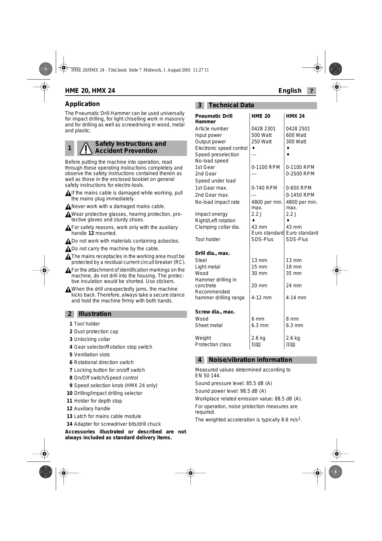 7 HME 20HMX 24 - Titel.book Seite 7 Mittwoch, 1. August 2001 11:27 11 / HME 20, HMX 24 English #7 Application 3 Technical Data The Pneumatic Drill Hammer can be used universally ic ri for impact drling, for light chiseling work in masonry… neumatic Dril HME 20 HMX 24 and for dilling as well as screwdriving in wood, metal and plastic. Article number 04282301 |0428 2501 Input power 500 Watt | 600 Watt Safety Instructions and Output power 250Watt |300 Watt 1 IN Accident Prevention Electronic speed control | » . Speed preselection |-- . Before putting the machine into operation, read No-load speed through these operating instructions completely and 1stGear 0-1100 RPM |0-1100 RPM observe the safety instructions contained therein as 2nd Gear — 0-2500 RPM well as those in the enclosed booklet on general Speed under load safety instructions for electro1o0is. Tét Gear max, o-720RPM |0:650 RPM Atfthe mains cable is damaged while working, pull 2nd Gear max. H 0-1450 RPM ANerer nou à damaged mains cable No-load impactrate | 4800 per min. | 4800 per min. 3 max. max ear protective glasses, hearing protection, pro- Impact enert . . w tective gl hearing protection, p Impact energy 22 22 tective gloves and sturdy shoes Right/Left rotation . . AFor safety reasons, work only with the auxiliary Clamping collar dia. |43 mm 43 mm handle 12 mounted. Euro standard| Euro standard À Do not work with materials containing asbestos Tool holder SDS-Plus |SDS-Plus ÀDo not carry the machine by the cable. in ai AThe mains receptacles in the working area mustbe Prill dia, max. protected by a residual current circuit breaker (RC). sel 13 mm 13 mm AForthe atachmentofidentication markings onthe … HgNE met sun por machine, do not drill into the housing. The protec- 00 un mm mm tive insulation would be shorted. Use stickers: Hammer drilling in 20 24 AWhen the drill unexpectedly jams, the machine Recommended mm mm kicks back. Therefore, always take a secure stance : : and hold the machine firmly with both hands. hammer driling range |4-12mm |4-14mm 2 Illustration Screw dia, max. Wood 6 mm 8 mm 1 Tool holder Sheet metal 6.3 mm 6.3 mm 2 Dust protection cap 3 Unlocking collar Weight 2.6 kg 2.6 kg 4 Gear selector/Rotation stop switch Protection class pol pool 5 Ventilation slots 6 Rotational direction switch 7 Locking button for on/off switch 8 On/Off switch/S peed control 9 Speed selection knob (HMX 24 only) 10 Drilling/mpact driling selector 11 Holder for depth stop 12 Auxiliary handle 13 Latch for mains cable module 14 Adapter for screwdriver bits/drill chuck Accessories always included as standard delivery items. illustrated or described are not 4 Noise/vibration information Measured values determined according to EN 50 144 Sound pressure level: 85.5 dB (A) Sound power level: 98.5 dB (A) Workplace related emission value: 88.5 dB (A). For operation, noise protection measures are required. The weighted acceleration is typically 8.6 m/s2.