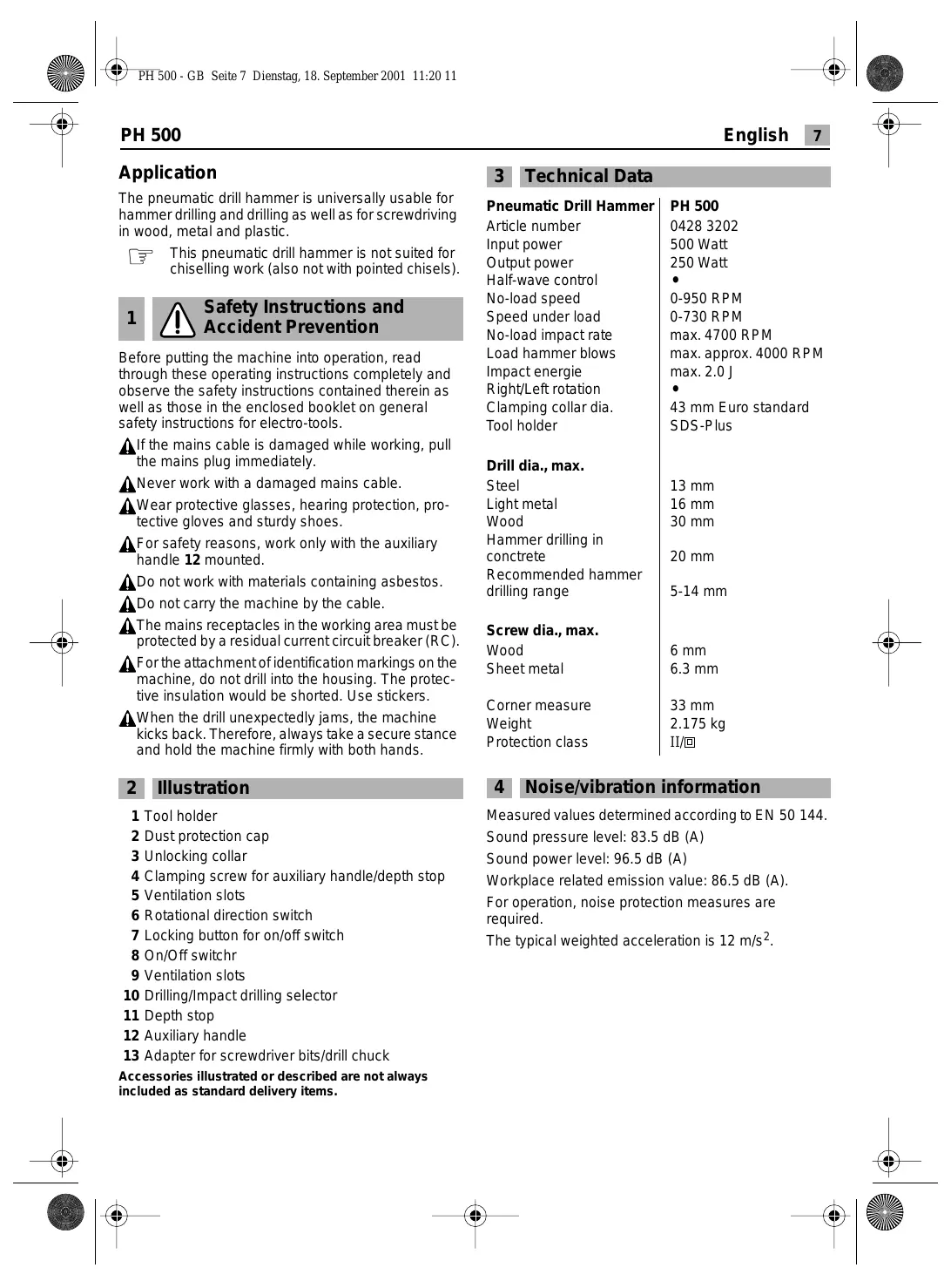 13 mm 16 mm 30 mm 20 mm Noise/vibration information Measured values determined according to EN 50 144. Sound pressure level: 83.5 dB (A) Sound power level: 96.5 dB (A) Workplace related emission value: 86.5 dB (A). For operation, noise protection measures are required. The typical weighted acceleration is 12 m/s 2. PH 500 - GB Seite 8 Montag, 17. September 2001 1:20 13