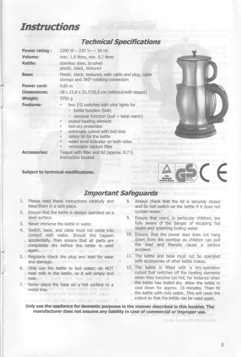 11. Ne jamäis utiliserun röcipientou un socle d'uneautremaroue. 12. Le bouilloireexpresest 6quipdd'unes6curitd de chauffesans liquidequi l€teint lorsque l'eau s'est 6vapor6e. Laissez l'appareil refroidirDendant environ15 min.Remolissezle ensuited'eaufroide.Las6curit6de chauffe et sans liquide s€teint automatiouement prötä fonctionner. l'appareil estä nouveau Läpparcil est pr6vue pour l'utilisation dans les menages. Le manufacteurd€clinetoute rcsponsabilit6en cas d'usageinapprcprid ou inconecte ou aprts que des r6parationsont 6t6 faites par des tiers.