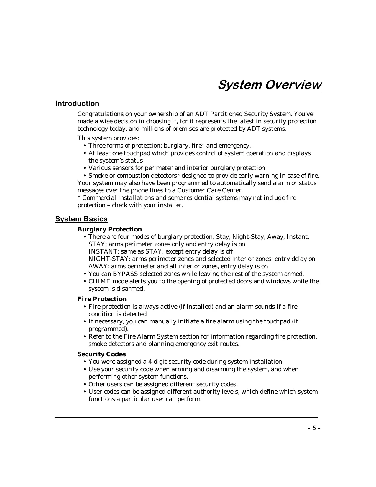 System Overview Introduction Congratulations on your ownership of an ADT Partitioned Security System. You've made a wise decision in choosing it, for it represents the latest in security protection technology today, and millions of premises are protected by ADT systems. This system provides: + Three forms of protection: burglary, fire* and emergency. + At least one touchpad which provides control of system operation and displays the system's status + Various sensors for perimeter and interior burglary protection + Smoke or combustion detectors* designed to provide early warning in case of fire. Your system may also have been programmed to automatically send alarm or status messages over the phone lines to a Customer Care Center.