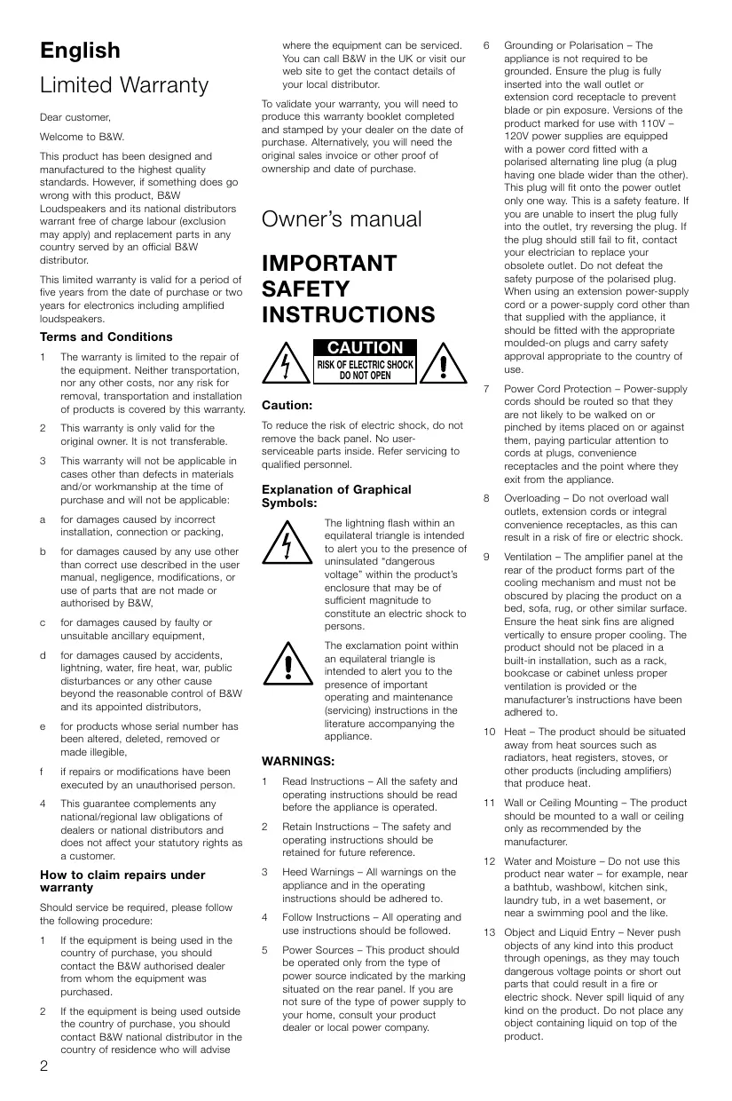 Limited Warranty Dear customer, Welcome to B&W. This product has been designed and manufactured to the highest quality standards. However, if something does go wrong with this product, B&W Loudspeakers and its national distributors warrant free of charge labour (exclusion may apply) and replacement parts in any country served by an official B&W distributor. This limited warranty is valid for a period of five years from the date of purchase or two years for electronics including amplified loudspeakers.