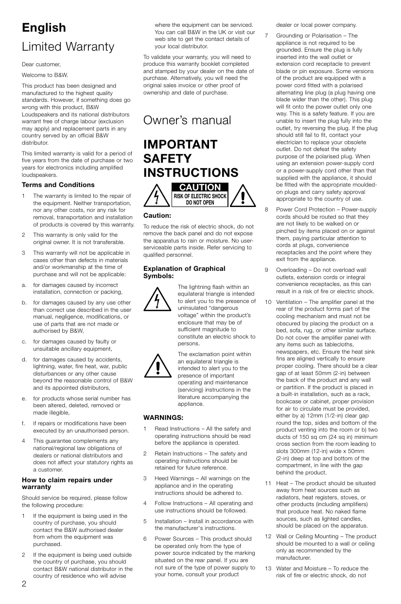 Dear customer, Welcome to B&W. This product has been designed and manufactured to the highest quality standards. However, if something does go wrong with this product, B&W Loudspeakers and its national distributors warrant free of charge labour (exclusion may apply) and replacement parts in any country served by an official B&W distributor. This limited warranty is valid for a period of five years from the date of purchase or two years for electronics including amplified loudspeakers.