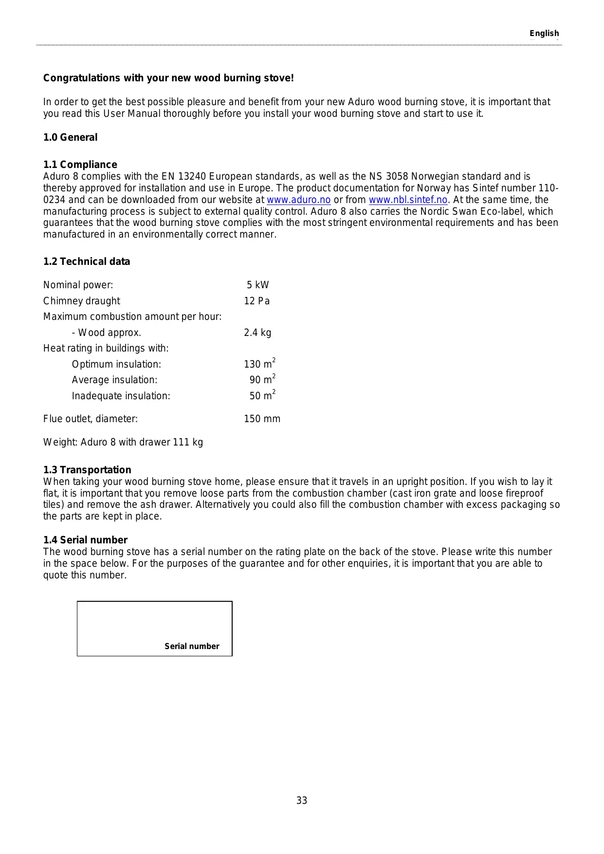 The wood burning stove has a serial number on the rating plate on the back of the stove. Please write this number in the space below. For the purposes of the guarantee and for other enquiries, it is important that you are able to quote this number. Serial number