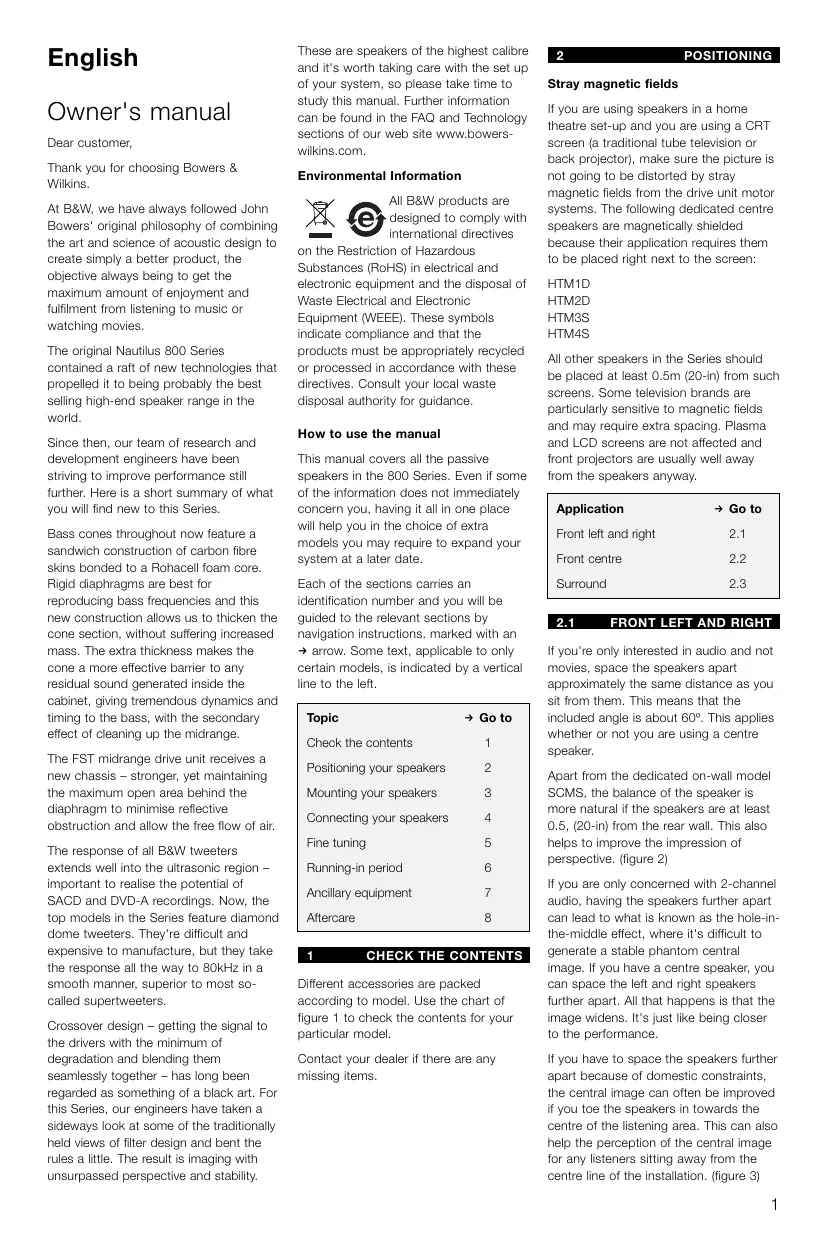 These are speakers of the highest calibre and it's worth taking care with the set up of your system, so please take time to study this manual. Further information can be found in the FAQ and Technology sections of our web site www.bowerswilkins.com. Environmental Information All B&W products are designed to comply with international directives on the Restriction of Hazardous Substances (RoHS) in electrical and electronic equipment and the disposal of Waste Electrical and Electronic Equipment (WEEE). These symbols indicate compliance and that the products must be appropriately recycled or processed in accordance with these directives. Consult your local waste disposal authority for guidance. How to use the manual This manual covers all the passive speakers in the 800 Series. Even if some of the information does not immediately concern you, having it all in one place will help you in the choice of extra models you may require to expand your system at a later date. Each of the sections carries an identification number and you will be guided to the relevant sections by navigation instructions. marked with an f arrow. Some text, applicable to only certain models, is indicated by a vertical line to the left. Topic