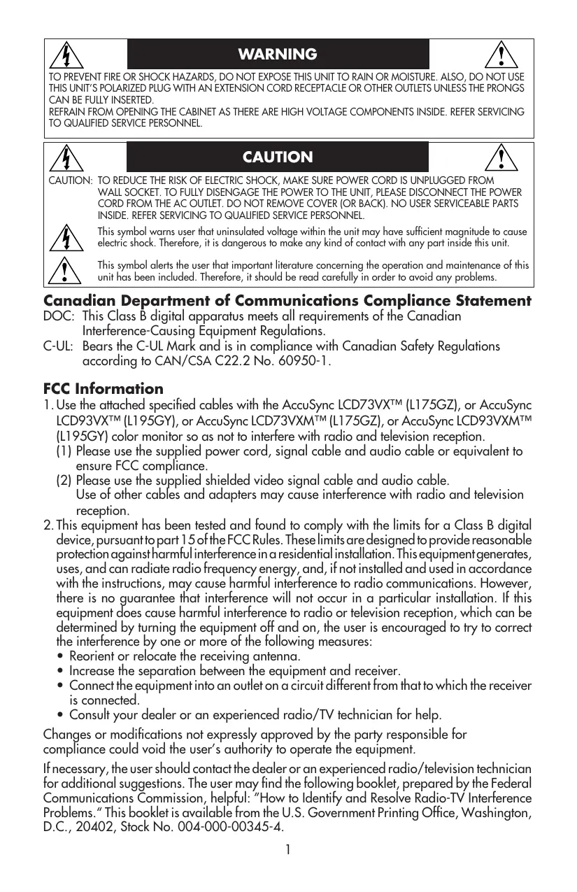- Use the attached specified cables with the AccuSync LCD73VXTM (L175GZ), or AccuSync LCD93VXTM (L195GY), or AccuSync LCD73VXMTM (L175GZ), or AccuSync LCD93VXMTM (L195GY) color monitor so as not to interfere with radio and television reception.