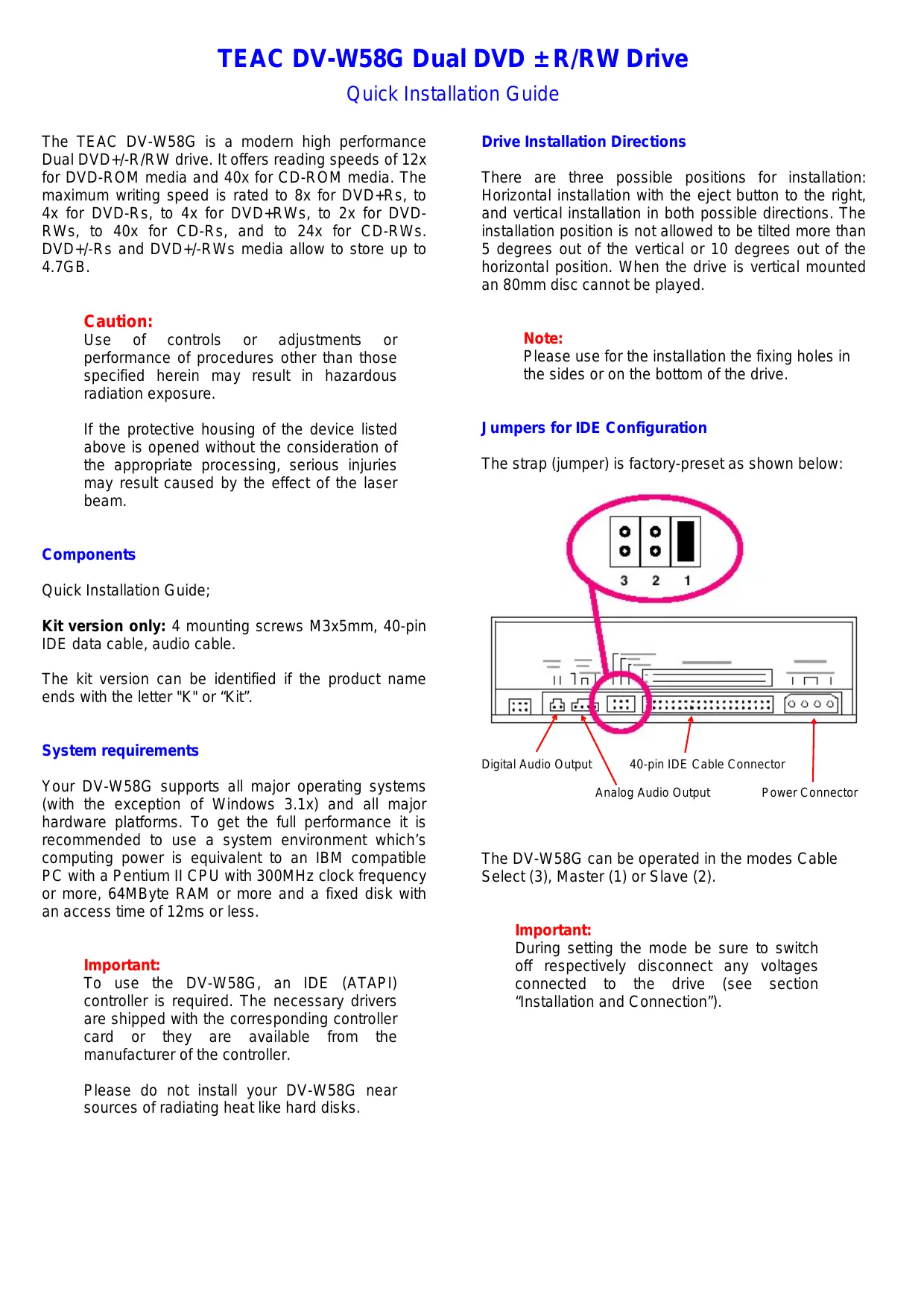 TEAC DV-W58G Dual DVD +R/RW Drive Quick Installation Guide The TEAC DV-W58G is a modern high performance Dual DVD+/-R/RW drive. It offers reading speeds of 12x for DVD-ROM media and 40x for CD-ROM media. The maximum writing speed is rated to 8x for DVD+RSs, to 4x for DVD-Rs, to 4x for DVD+4RWSs, to 2x for DVD- RWs, to 40x for CD-Rs, and to 24x for CD-RWs. DVD+/-Rs and DVD+/-RWs media allow to store up to 4.1GB. Caution: Use of controls or adjustments or performance of procedures other than those specified herein may result in hazardous radiation exposure. If the protective housing of the device listed above is opened without the consideration of the appropriate processing, serious injuries may result caused by the effect of the laser beam. Components Quick Installation Guide; Kit version only: 4 mounting screws M3x5mm, 40-pin IDE data cable, audio cable. The kit version can be identified if the product name ends with the letter "K" or “Kit”. System requirements Your DV-W58G supports all major operating systems (with the exception of Windows 3.1x) and all major hardware platforms. To get the full performance it is recommended to use à system environment which's computing power is equivalent to an IBM compatible PC with a Pentium II CPU with 300MHz clock frequency or more, 64MByte RAM or more and a fixed disk with an access time of 12ms or less. Important: To use the DV-W58G, an IDE (ATAPI) controller is required. The necessary drivers are shipped with the corresponding controller card or they are available from the manufacturer of the controller. Please do not install your DV-W58G near sources of radiating heat like hard disks. Drive Installation Directions There are three possible positions for installation: Horizontal installation with the eject button to the right, and vertical installation in both possible directions. The installation position is not allowed to be tilted more than 5 degrees out of the vertical or 10 degrees out of the horizontal position. When the drive is vertical mounted an 80mm disc cannot be played. Note: Please use for the installation the fixing holes in the sides or on the bottom of the drive. J umpers for IDE Configuration The strap (jumper) is factory-preset as shown below: J Css] Digital Audio Output 40-pin IDE Cable Connector Analog Audio Output Power Connector The DV-W58G can be operated in the modes Cable Select (3), Master (1) or Slave (2). Important: During setting the mode be sure to switch off respectively disconnect any voltages connected to the drive (see section “Installation and Connection”).