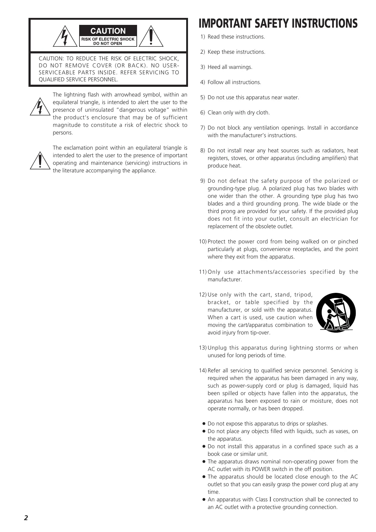 CAUTION: TO REDUCE THE RISK OF ELECTRIC SHOCK, DO NOT REMOVE COVER (OR BACK). NO USERSERVICEABLE PARTS INSIDE. REFER SERVICING TO QUALIFIED SERVICE PERSONNEL.