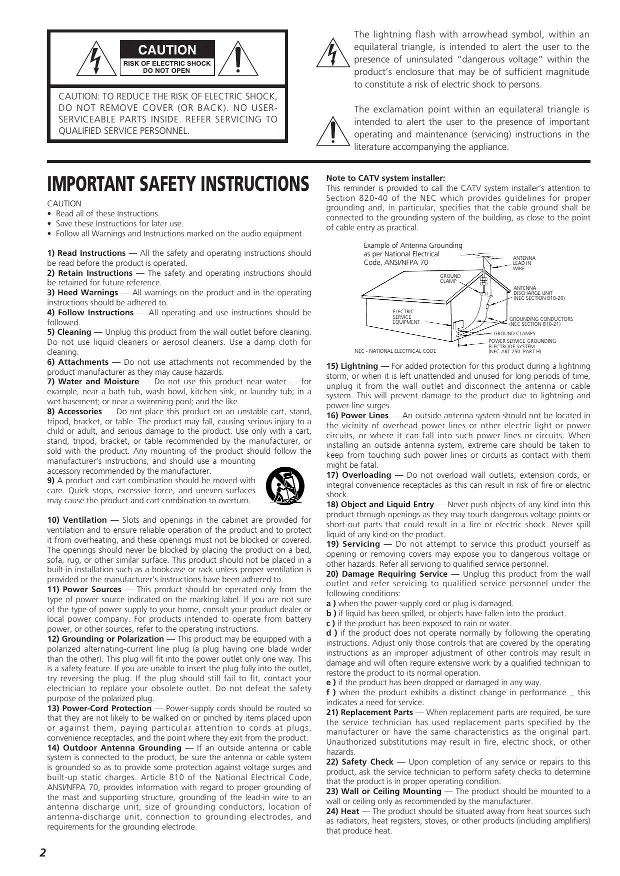 The exclamation point within an equilateral triangle is intended to alert the user to the presence of important operating and maintenance (servicing) instructions in the literature accompanying the appliance. Note to CATV system installer: This reminder is provided to call the CATV system installer’s attention to
