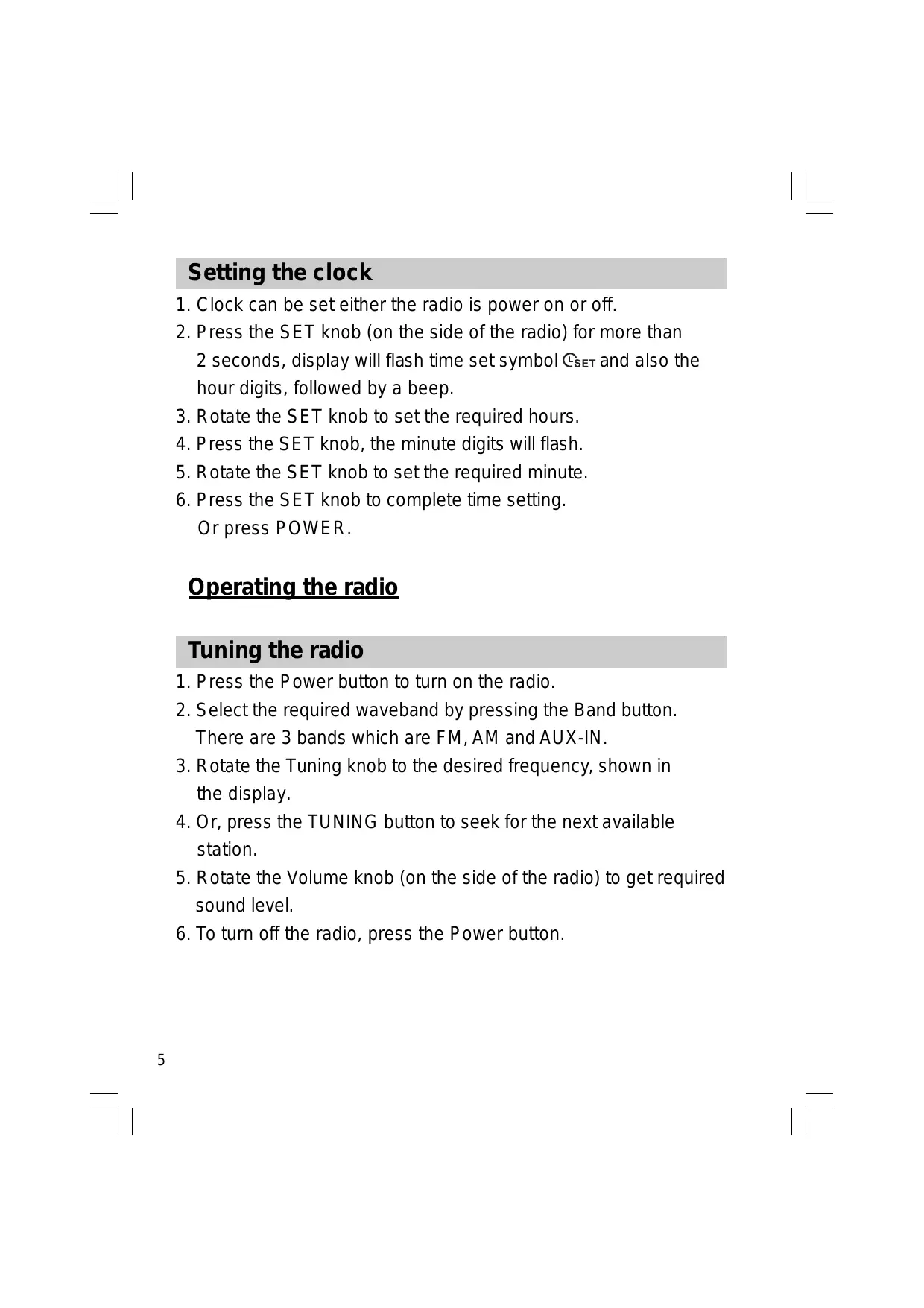 1. Clock can be set either the radio is power on or off.