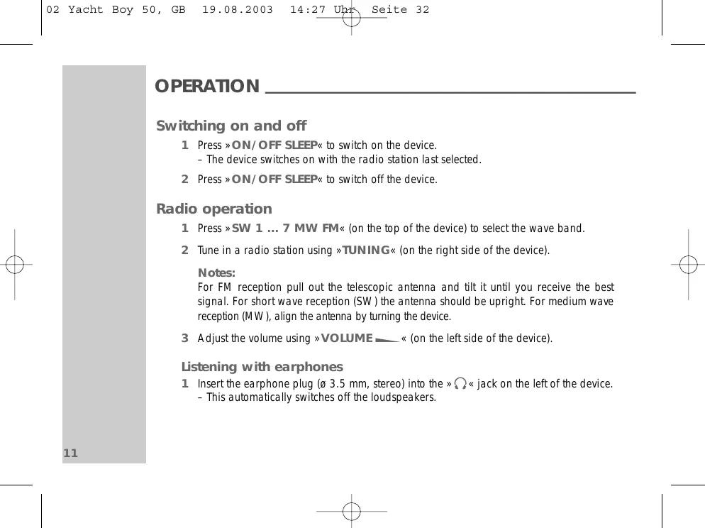 14:27 Uhr Seite 32 OPERATION ___________________________________________ Switching on and off 1 Press »ON/OFF SLEEP« to switch on the device. – The device switches on with the radio station last selected. 2 Press »ON/OFF SLEEP« to switch off the device. Radio operation 1 Press »SW 1 ... 7 MW FM« (on the top of the device) to select the wave band. 2 Tune in a radio station using »TUNING« (on the right side of the device). Notes: For FM reception pull out the telescopic antenna and tilt it until you receive the best signal. For short wave reception (SW) the antenna should be upright. For medium wave reception (MW), align the antenna by turning the device. 3 Adjust the volume using »VOLUME }« (on the left side of the device). Listening with earphones 1 Insert the earphone plug (ø 3.5 mm, stereo) into the »0« jack on the left of the device. – This automatically switches off the loudspeakers.