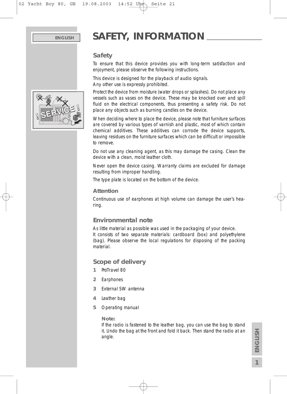 Nez SAFETY, INFORMATION Safety To ensure that this device provides you with long-term satisfaction and enjoyment, please observe the following instructions. This device is designed for the playback of audio signals. Any other use is expressly prohibited. Protectthe device from moisture (water drops or splashes). Do not place any vessels such as vases on the device. These may be knocked over and spill fluid on the electrical components, thus presenting à safety risk. Do not place any objects such as burning candles on the device. When deciding where to place the device, please note that furniture surfaces are covered by various types of varnish and plastic, most of which contain chemical additives. These additives can corrode the device supports, leaving residues on the furniture surfaces which can be difficult or impossible to remove. Do not use any cleaning agent, as this may damage the casing. Clean the device with a clean, moist leather cloth Never open the device casing. Warranty claims are excluded for damage resulting from improper handling. The type plate is located on the bottom of the device. Attention Continuous use of earphones at high volume can damage the user's hea- ring Environmental note As litfe material as possible was used in the packaging of your device It consists of two separate materials: cardboard (box) and polyethylene (bag). Please observe the local regulations for disposing of the packing material Scope of delivery 1 Poïravel 80 2 Earphones 3 External SW antenna 4 Leather bag