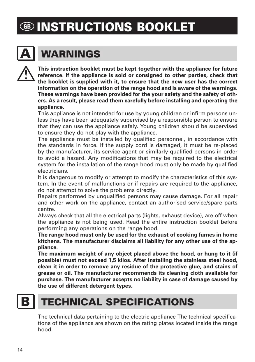 This instruction booklet must be kept together with the appliance for future reference. If the appliance is sold or consigned to other parties, check that the booklet is supplied with it, to ensure that the new user has the correct information on the operation of the range hood and is aware of the warnings. These warnings have been provided for the your safety and the safety of others. As a result, please read them carefully before installing and operating the appliance.