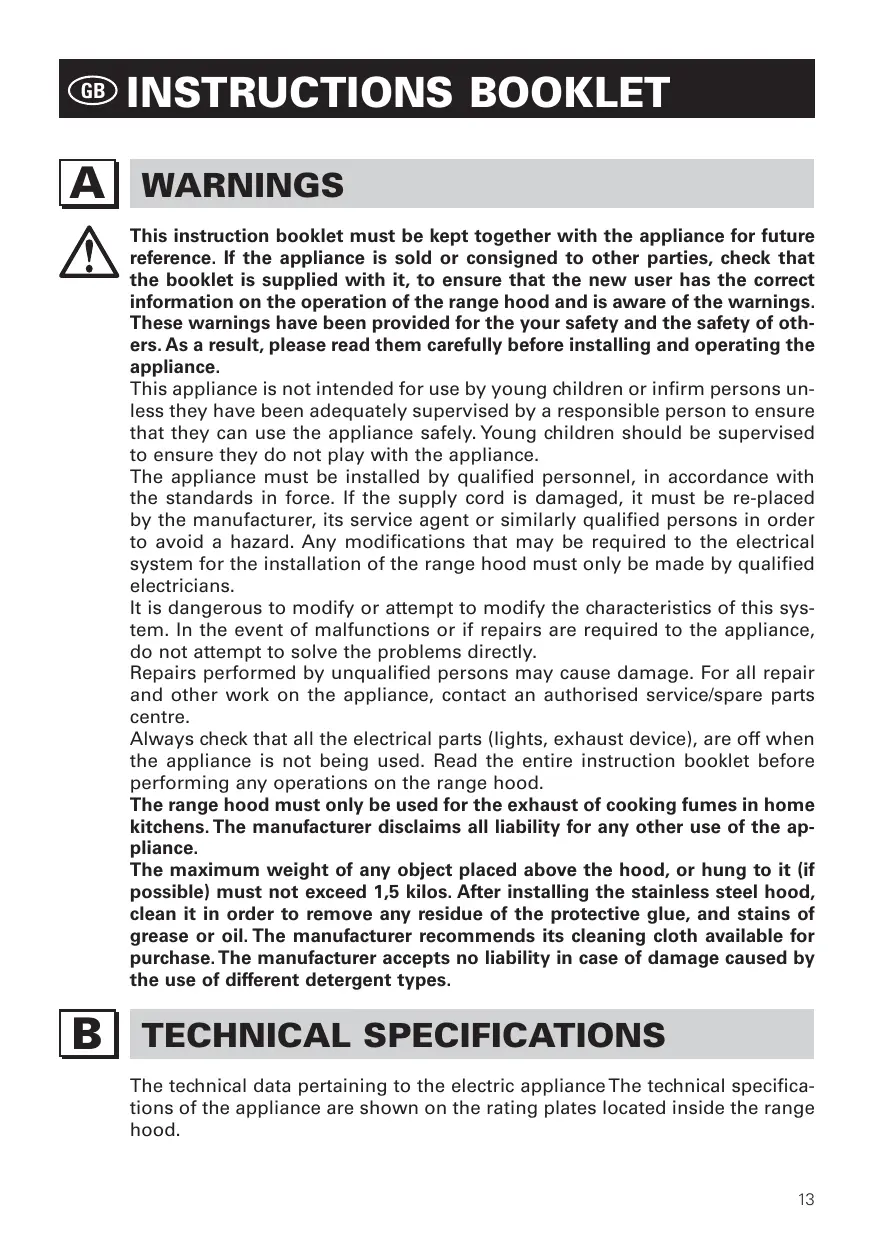 INSTRUCTIONS BOOKLET WARNINGS This instruction booklet must be kept together with the appliance for future reference. If the appliance is sold or consigned to other parties, check that the booklet is supplied with it, to ensure that the new user has the correct information on the operation of the range hood and is aware of the warnings. These warnings have been provided for the your safety and the safety of others. As a result, please read them carefully before installing and operating the appliance. This appliance is not intended for use by young children or infirm persons unless they have been adequately supervised by a responsible person to ensure that they can use the appliance safely. Young children should be supervised to ensure they do not play with the appliance. The appliance must be installed by qualified personnel, in accordance with the standards in force. If the supply cord is damaged, it must be re-placed by the manufacturer, its service agent or similarly qualified persons in order to avoid a hazard. Any modifications that may be required to the electrical system for the installation of the range hood must only be made by qualified electricians. It is dangerous to modify or attempt to modify the characteristics of this system. In the event of malfunctions or if repairs are required to the appliance, do not attempt to solve the problems directly. Repairs performed by unqualified persons may cause damage. For all repair and other work on the appliance, contact an authorised service/spare parts centre. Always check that all the electrical parts (lights, exhaust device), are off when the appliance is not being used. Read the entire instruction booklet before performing any operations on the range hood. The range hood must only be used for the exhaust of cooking fumes in home kitchens. The manufacturer disclaims all liability for any other use of the appliance. The maximum weight of any object placed above the hood, or hung to it (if possible) must not exceed 1,5 kilos. After installing the stainless steel hood, clean it in order to remove any residue of the protective glue, and stains of grease or oil. The manufacturer recommends its cleaning cloth available for purchase. The manufacturer accepts no liability in case of damage caused by the use of different detergent types.