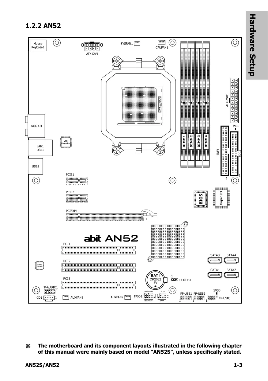 The motherboard and its component layouts illustrated in the following chapter of this manual were mainly based on model “AN52S”, unless specifically stated. AN52S/AN52 1-3