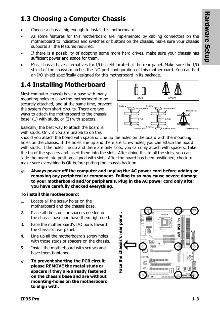 To prevent shorting the PCB circuit, please REMOVE the metal studs or spacers if they are already fastened on the chassis base and are without mounting-holes on the motherboard to align with. IP35 Pro Face the chassis’s rear panel. To install this motherboard:
