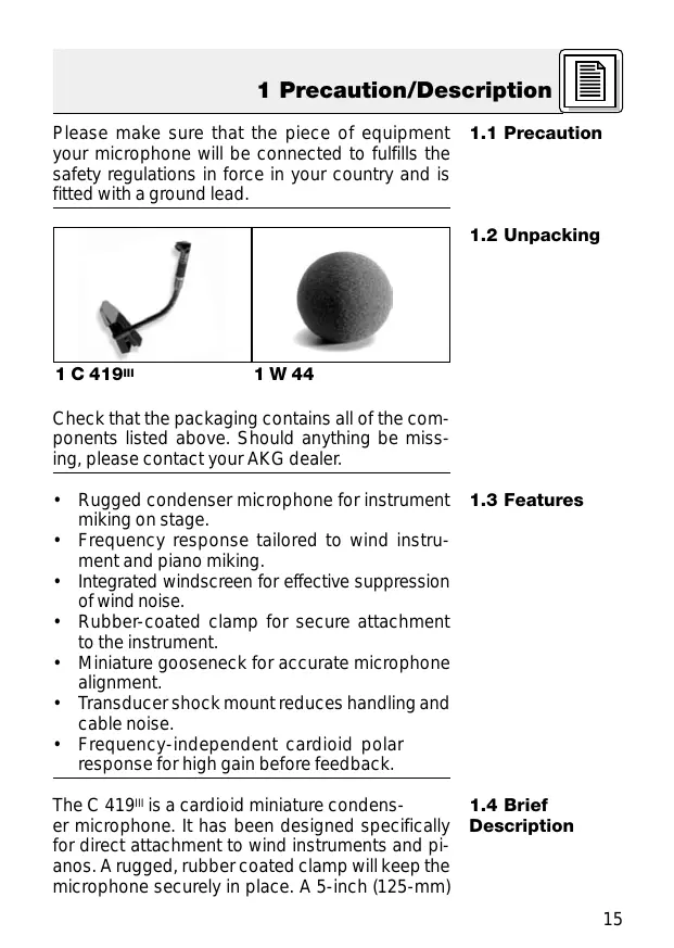 1 C 419III 1 W 44 Check that the packaging contains all of the components listed above. Should anything be missing, please contact your AKG dealer.
