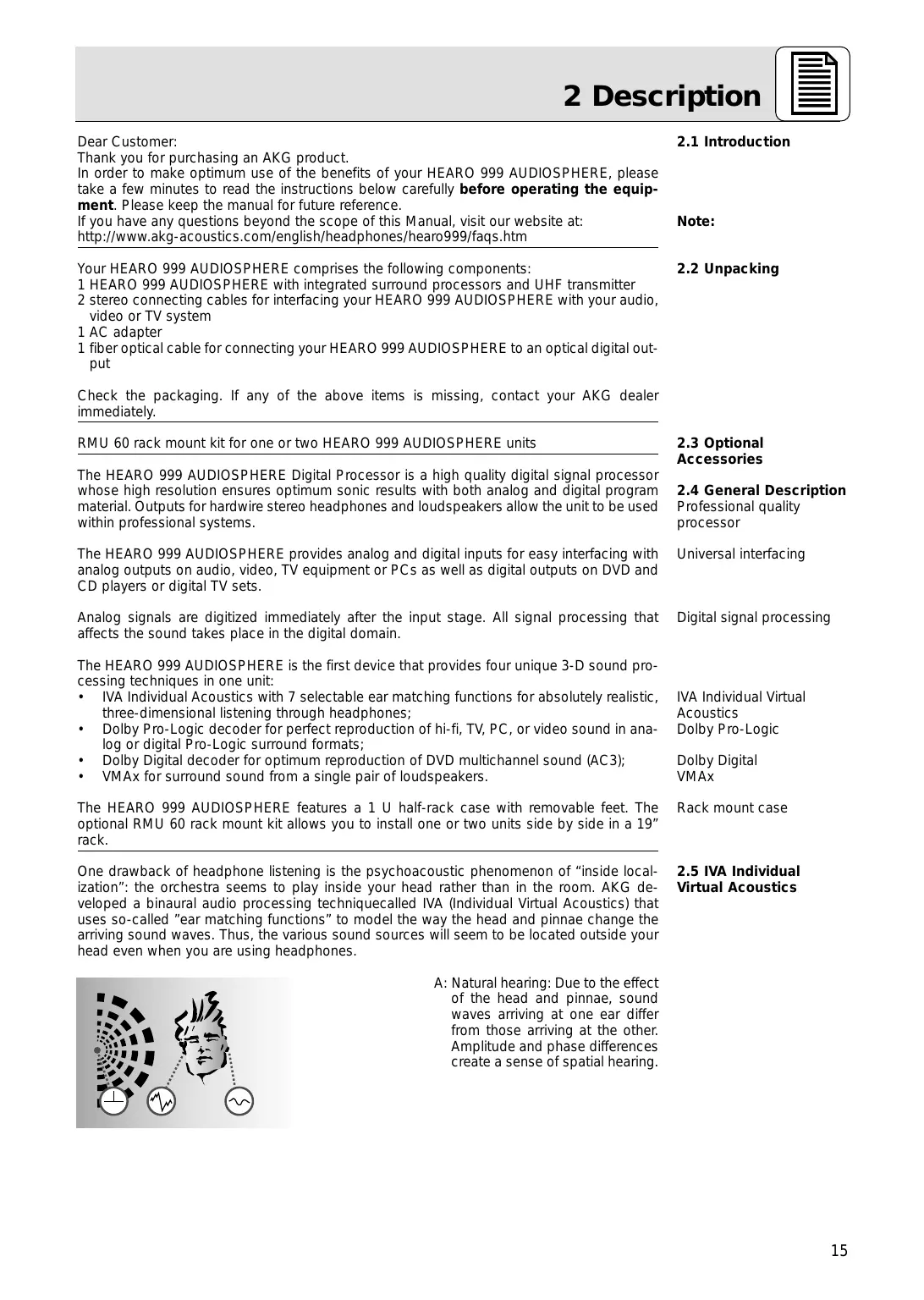 Note: Check the packaging. If any of the above items is missing, contact your AKG dealer immediately. RMU 60 rack mount kit for one or two HEARO 999 AUDIOSPHERE units The HEARO 999 AUDIOSPHERE Digital Processor is a high quality digital signal processor whose high resolution ensures optimum sonic results with both analog and digital program material. Outputs for hardwire stereo headphones and loudspeakers allow the unit to be used within professional systems.