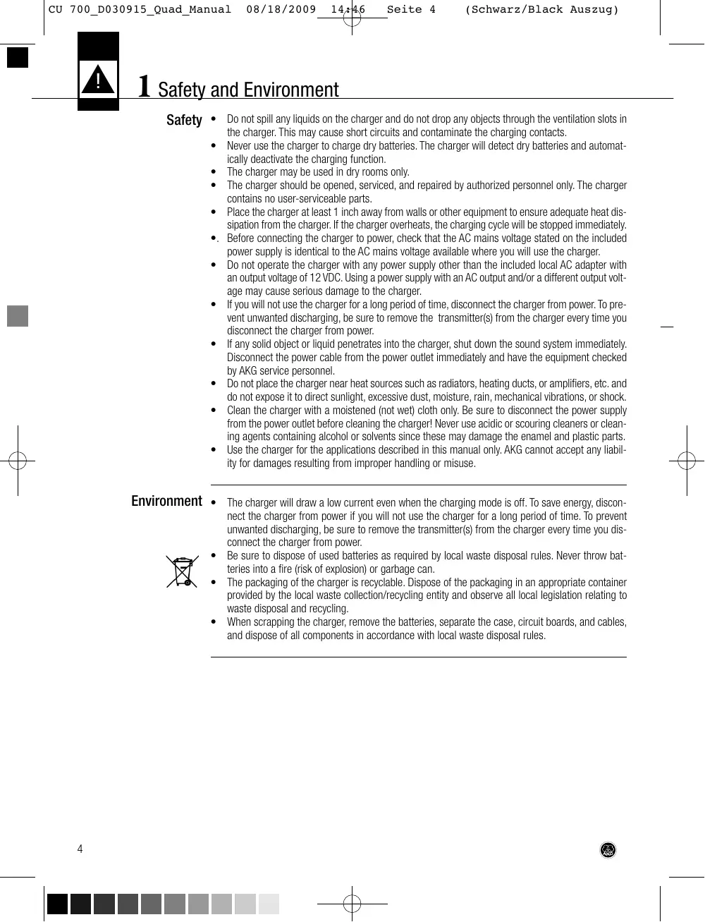 - Use the charger for the applications described in this manual only. AKG cannot accept any liability for damages resulting from improper handling or misuse. Environment