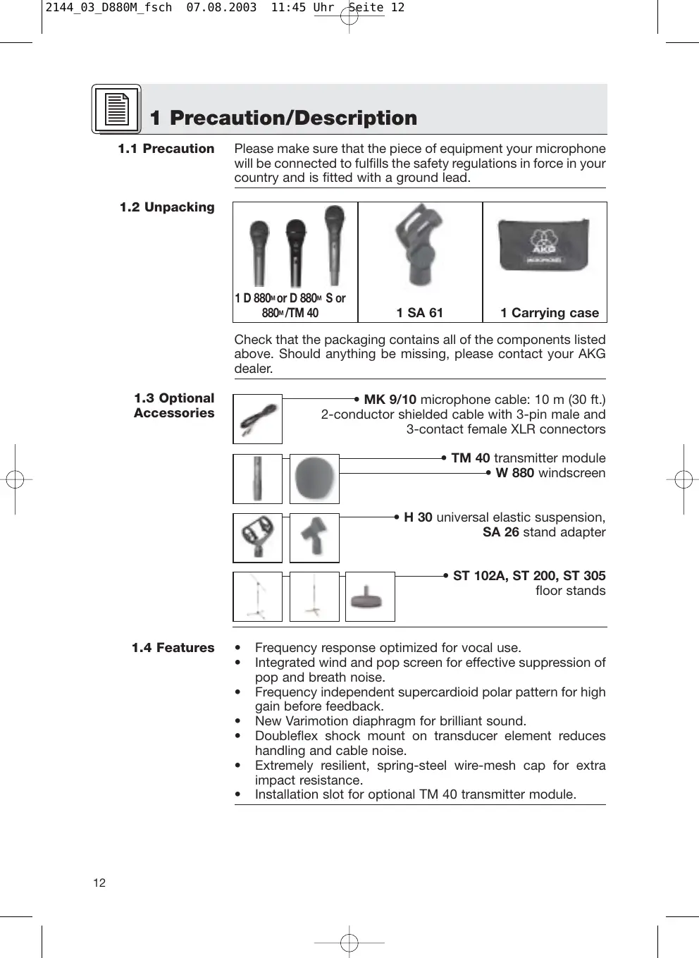 Check that the packaging contains all of the components listed above. Should anything be missing, please contact your AKG dealer.
